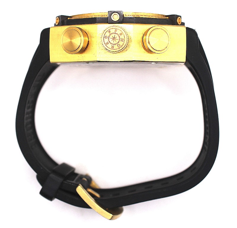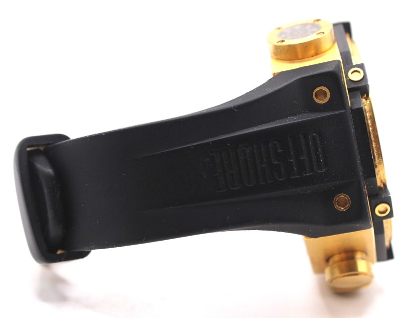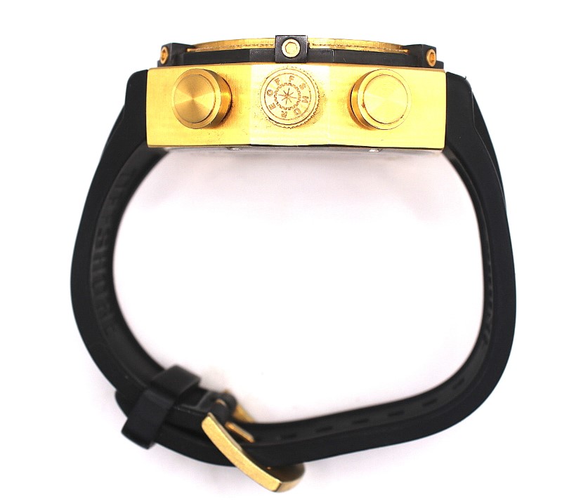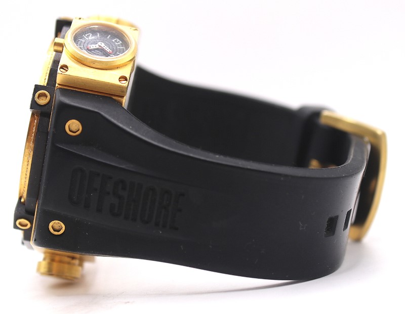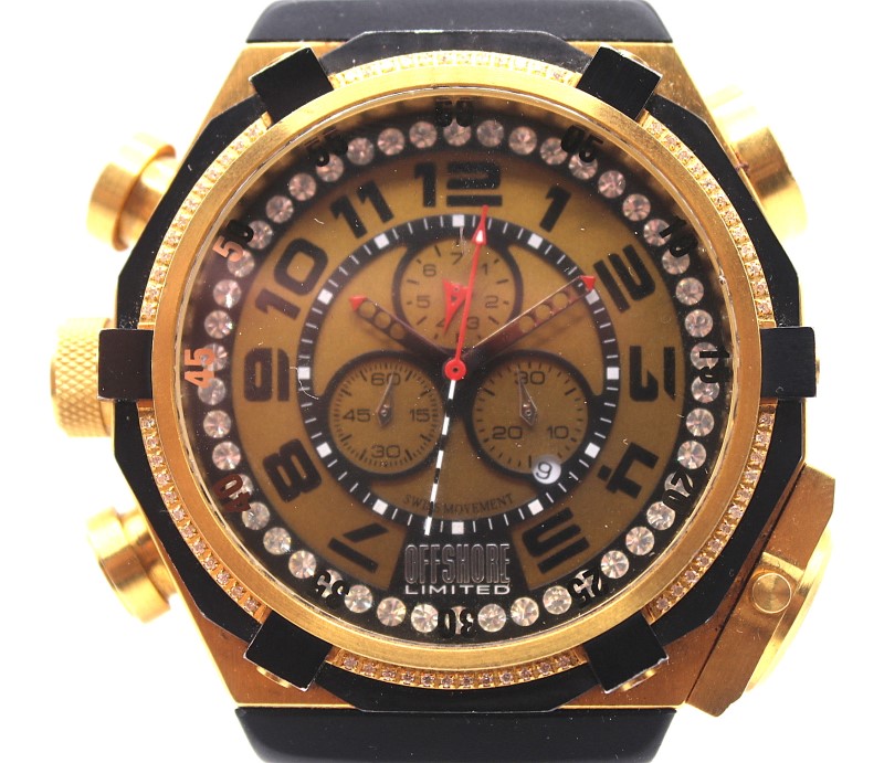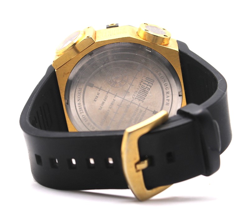 This classic OFFSHORE LIMITED 22810-Norm wrist watch features a striking yellow face with bold numbers displayed on a durable glass surface. The circular face is complemented by a sleek black plastic band, making it a stylish and practical timepiece suitable for men. With a weight of 199.98 grams, this watch offers a substantial and high-quality feel on the wrist.