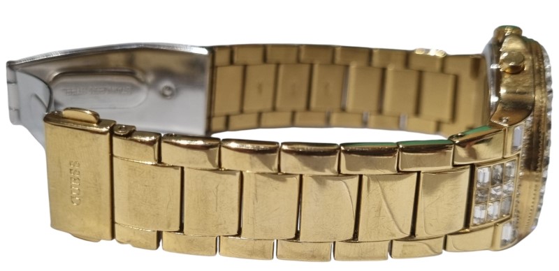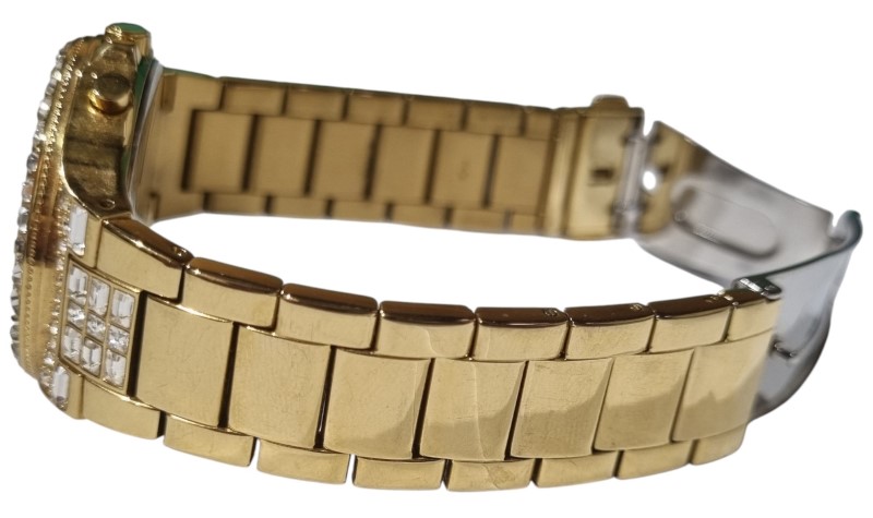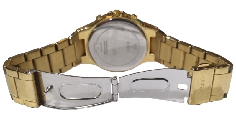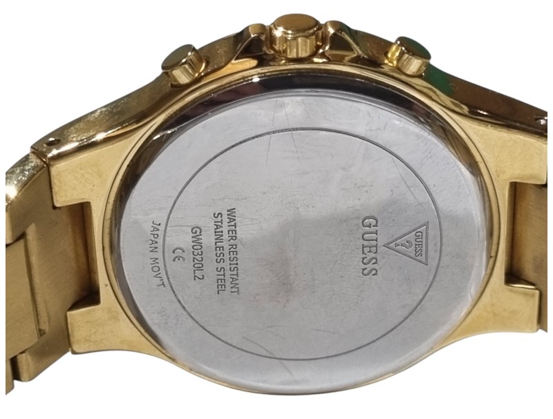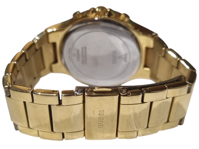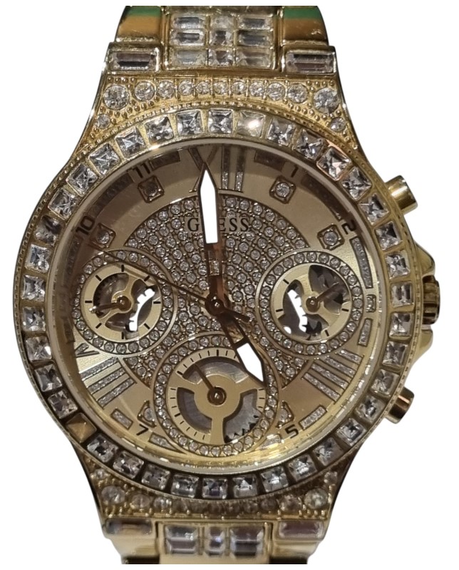 This pre-owned GUESS GW0320L2 ladies' watch features a classic circular face with a yellow metal design. The face displays numbers and is made of metal, while the band is also constructed from yellow metal. The watch is adorned with a total of 79 clear stones, ranging in carat from 0.01 to 0.05. However, it is missing one of the clear stones. Despite this minor flaw, this timepiece maintains a stylish and sophisticated appearance that would complement a variety of outfits.