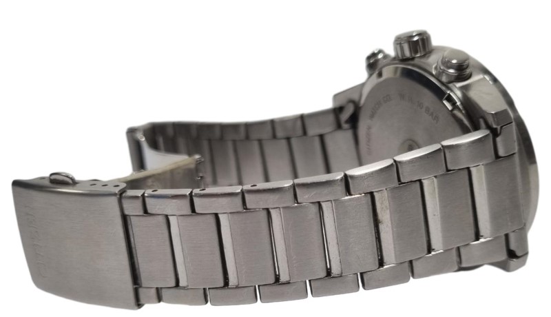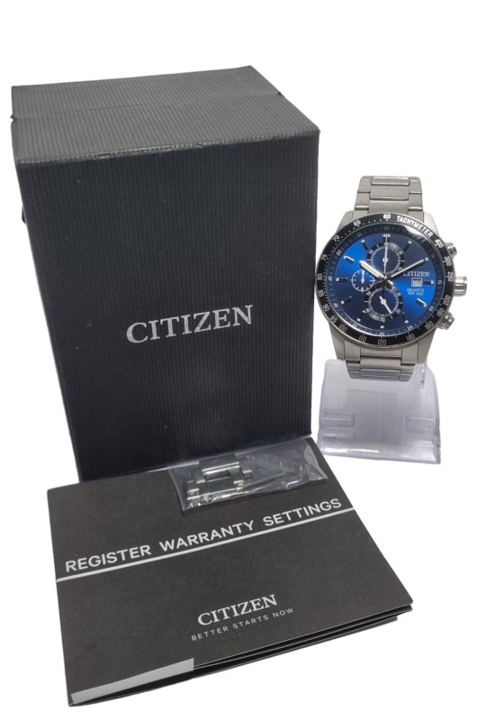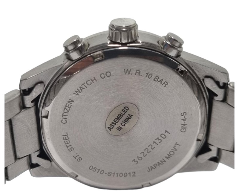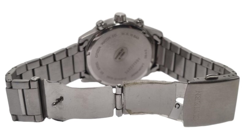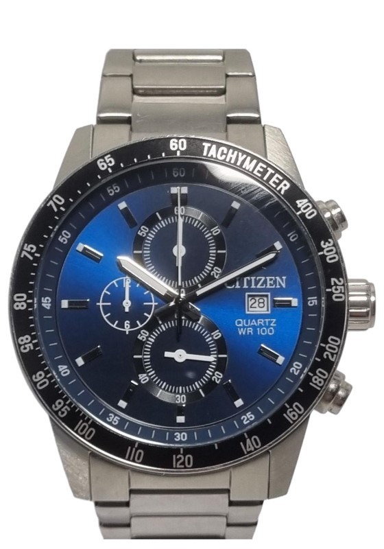 This pre-owned CITIZEN 0510-S110912 chronograph watch features a classic circular metal face with blue numerals. The metal band provides a durable and stylish look. With its chronograph functionality, this watch is a versatile accessory suitable for both casual and formal occasions.