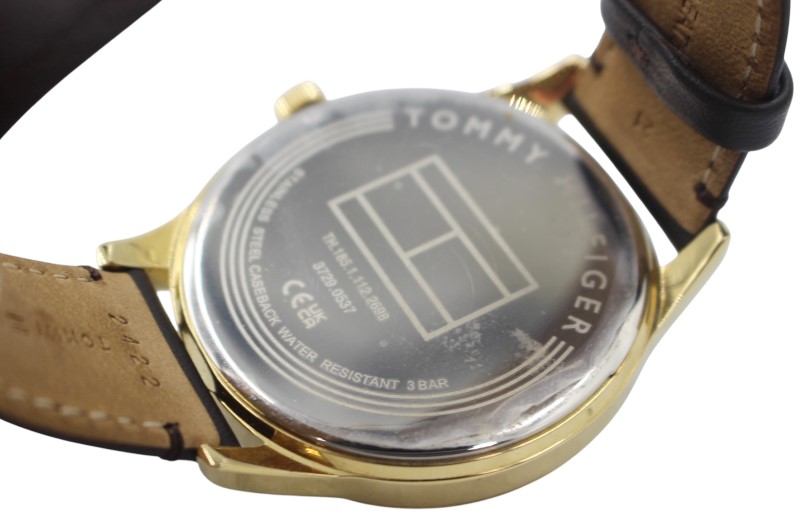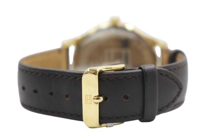 This pre-owned Tommy Hilfiger TH.185.1.112.2698 dress watch is a timeless accessory that exudes sophistication. The classic design features a stainless steel case and a sleek leather strap, making it suitable for both formal and casual occasions. The analog display provides a clean and legible time reading, while the quartz movement ensures reliable and accurate timekeeping.