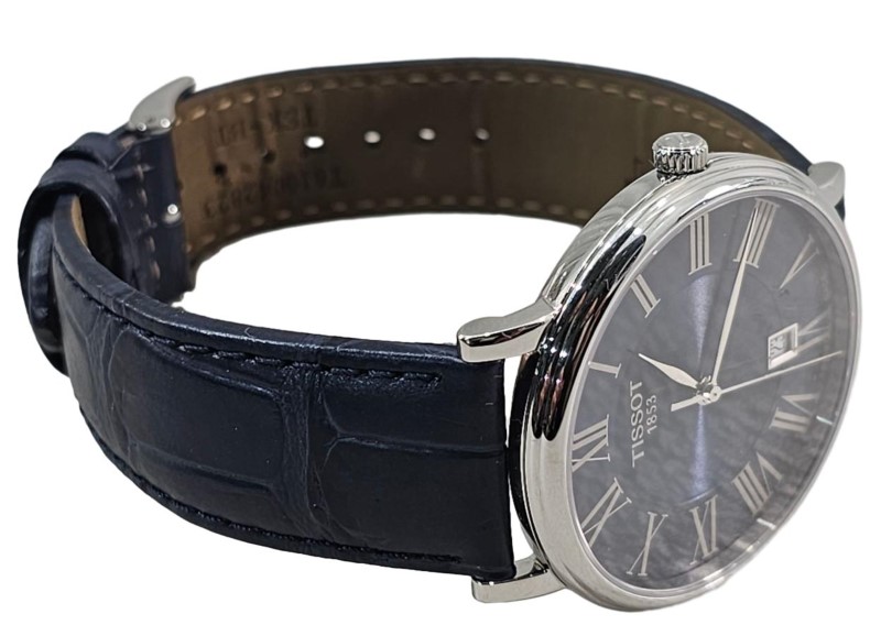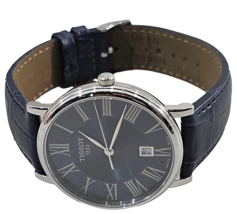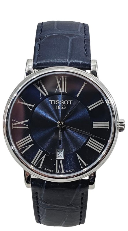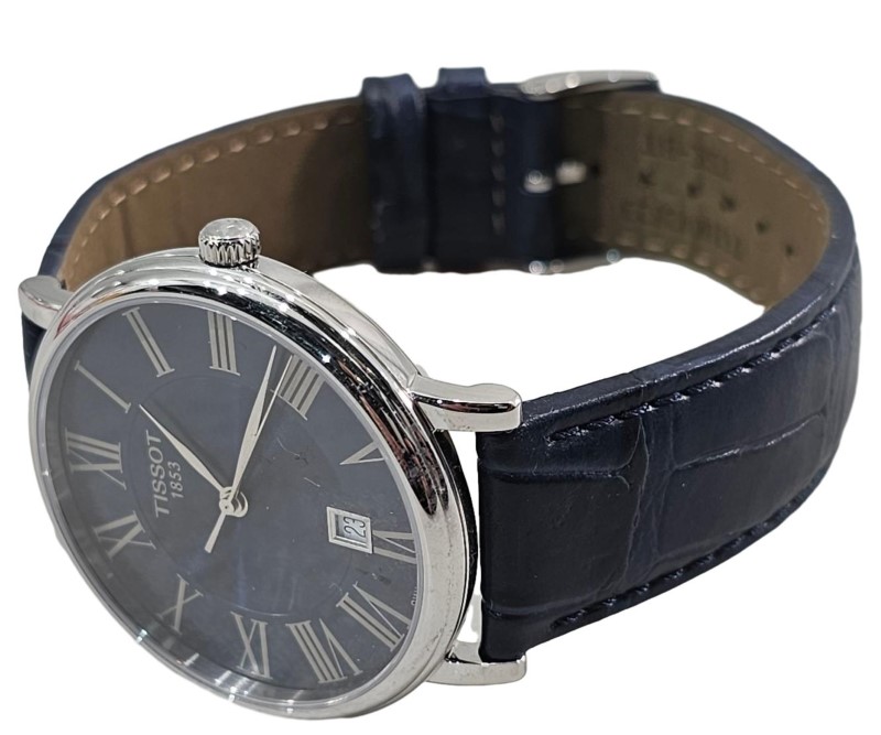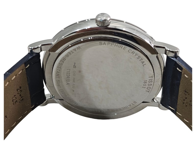 This pre-owned TISSOT T122410A wrist watch features a classic circular metal face with blue Roman numerals against a blue backdrop. The durable leather band in a complementary blue hue provides a comfortable and stylish fit for men. With its timeless design and quality construction, this secondhand timepiece will make a sophisticated addition to any wardrobe.