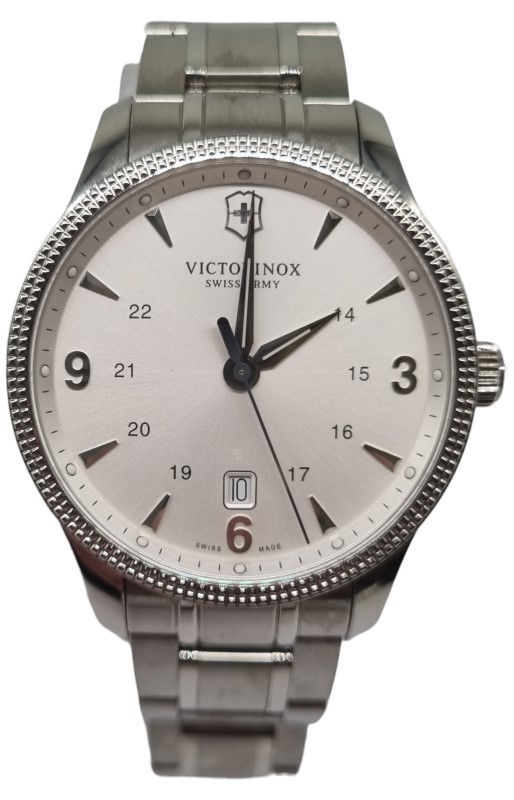 This classic Victorinox watch is a stylish and functional timepiece that will complement any outfit. The silver-toned metal band and circular face give it a timeless, sophisticated look, while the chronograph feature and Swiss Army knife add practical utility. The easy-to-read numerical display ensures you can quickly check the time, making this watch a versatile choice for both formal and casual wear. Whether you're dressing up or down, this Victorinox watch will elevate your style.