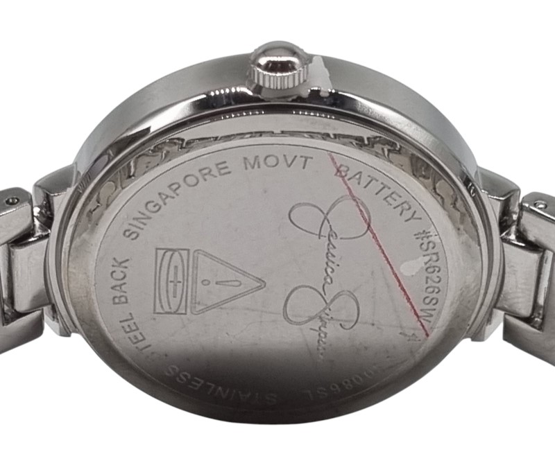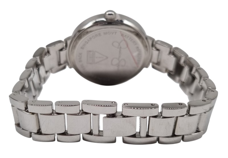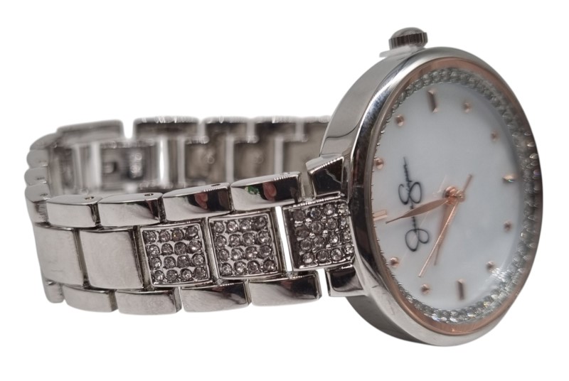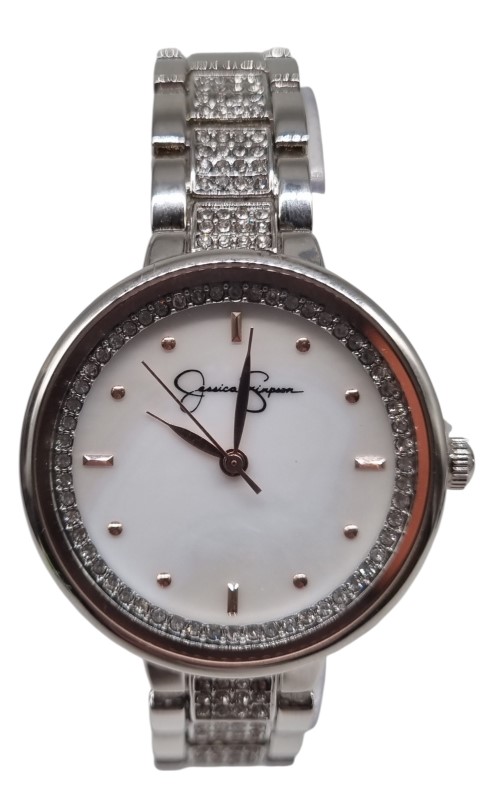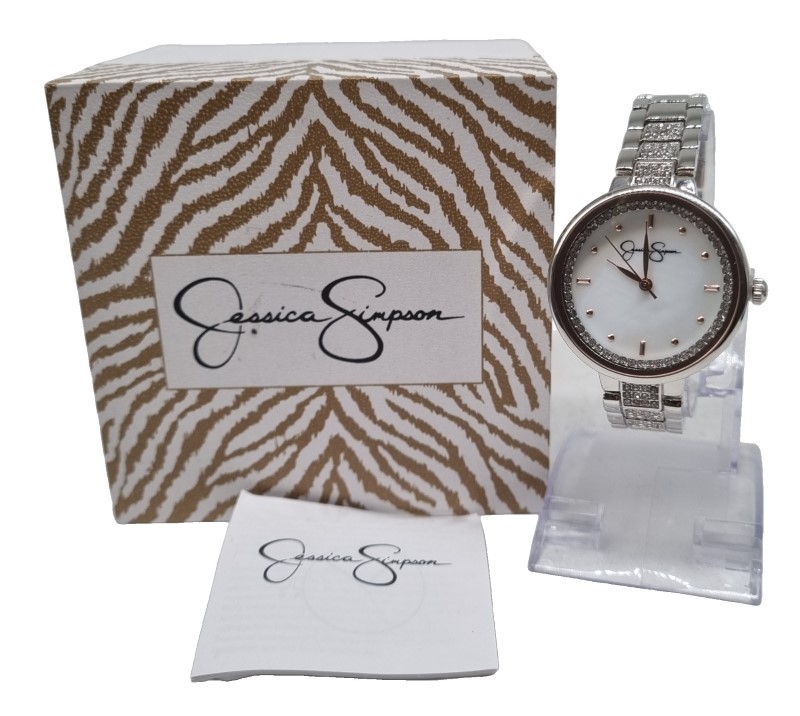 This elegant Jessica Simpson watch features a stunning crystal and genuine mother-of-pearl dial set against a sleek silver-toned metal band. The classic circular face and sophisticated design make this the perfect accessory for any formal or casual occasion. With its factory-sealed condition, this timepiece is sure to impress.