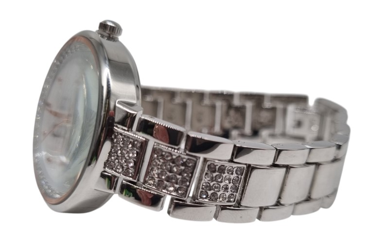 Crystal & Genuine Mother Of Pearl Dial Watch In Silver Tone
