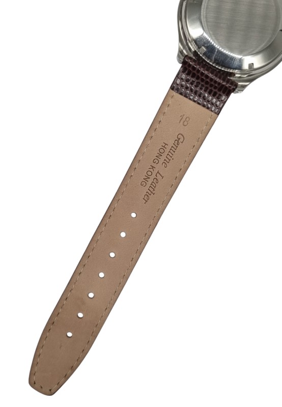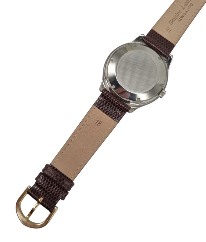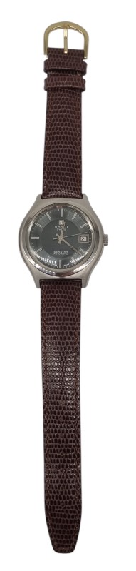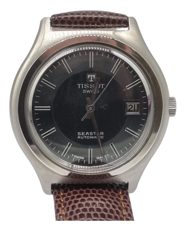 This TISSOT Seastar Automatic dress watch features a classic circular face with a black dial and sleek metal construction. The brown leather band complements the sophisticated look, making it a versatile choice for both casual and formal occasions. The automatic movement ensures reliable timekeeping, while the lines display provides a minimalist aesthetic. This pre-owned timepiece is a timeless accessory that will elevate any outfit.