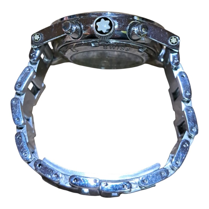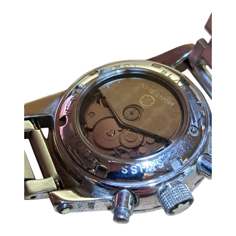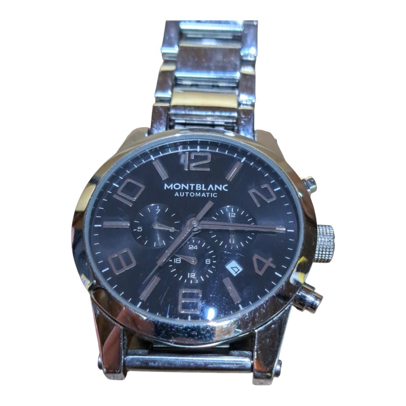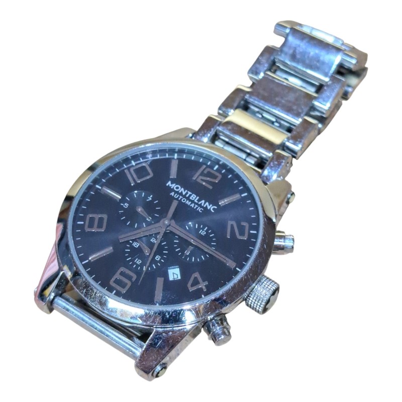 This stylish Montblanc 9168 watch features a sleek silver metal band and a classic face with bold numeric display. The chronograph function allows for precise time tracking, making it a practical choice for the modern gentleman. With its timeless design and reliable performance, this pre-owned timepiece is a versatile accessory that can elevate any outfit.