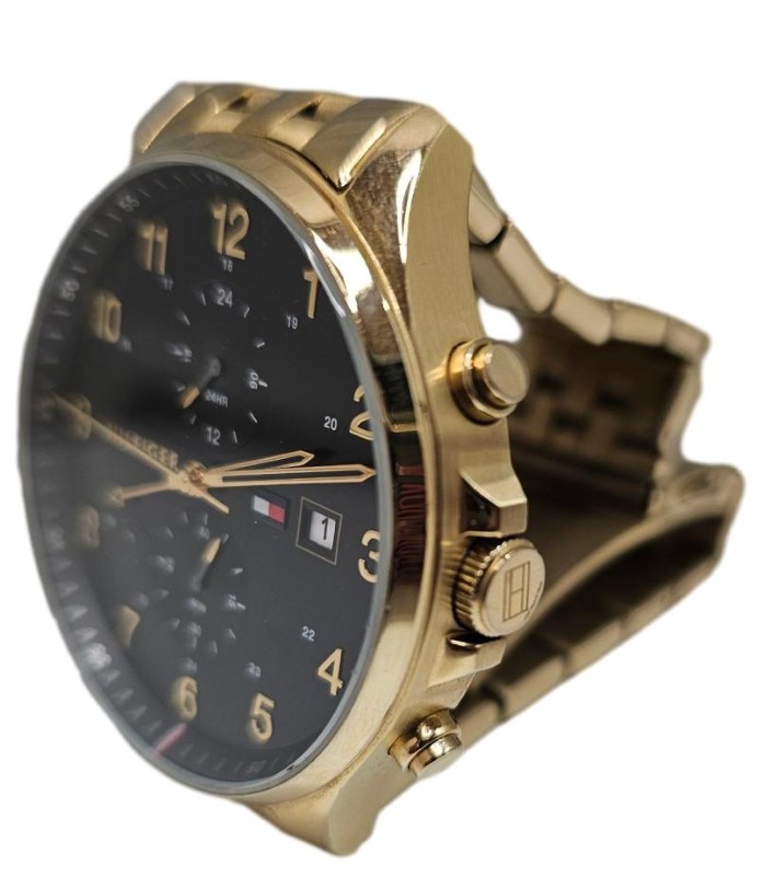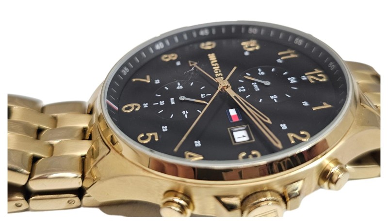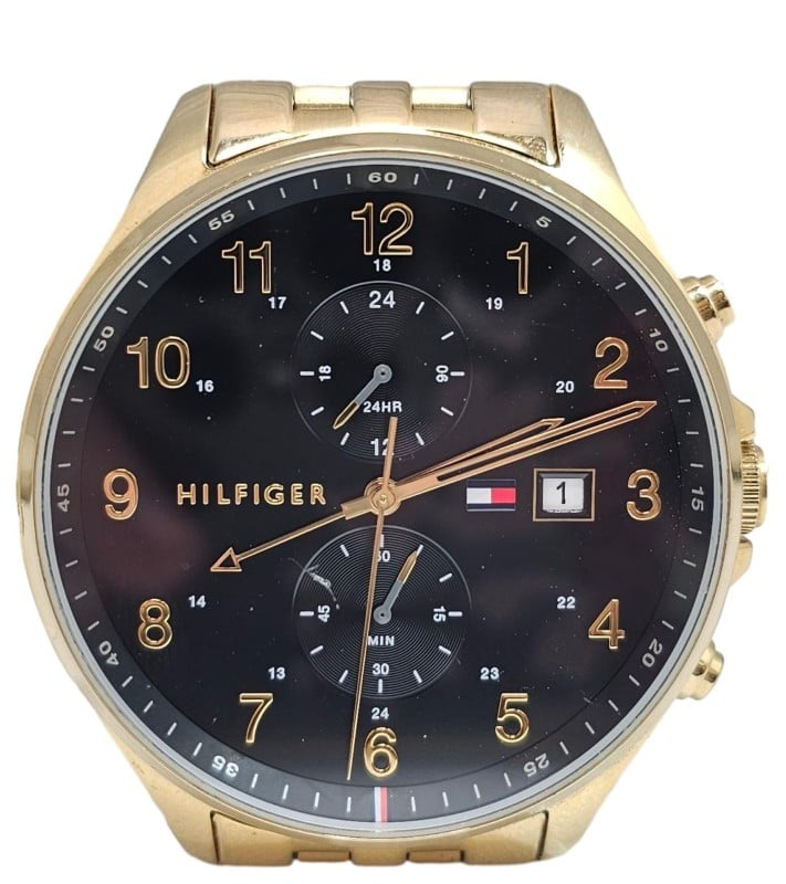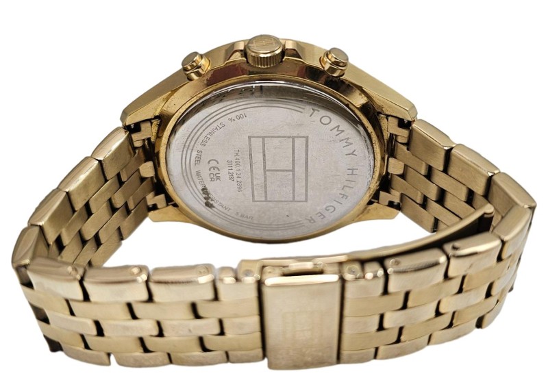 This pre-owned TOMMY HILFIGER watch features a sleek and stylish design that is perfect for any occasion. The circular face displays the time clearly with bold numbers, while the yellow metal band adds a touch of sophistication. Crafted with unisex appeal, this dress watch is a versatile accessory that can be dressed up or down to suit your style.