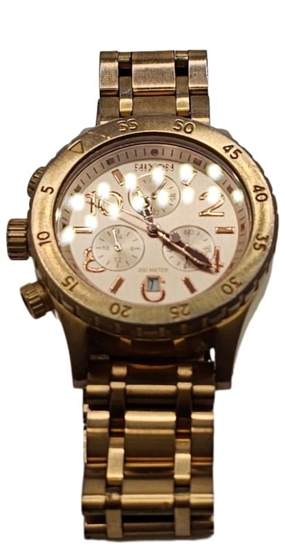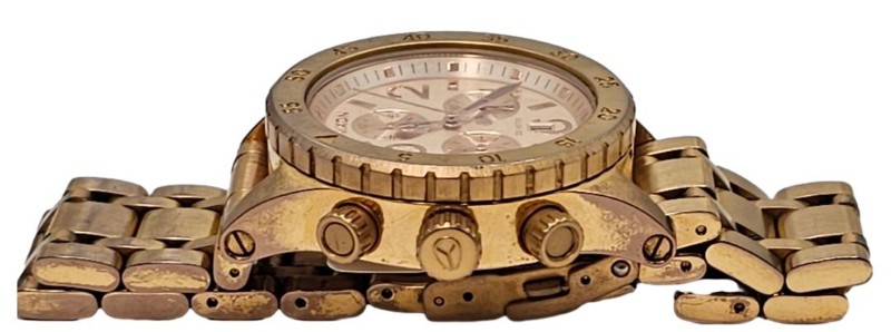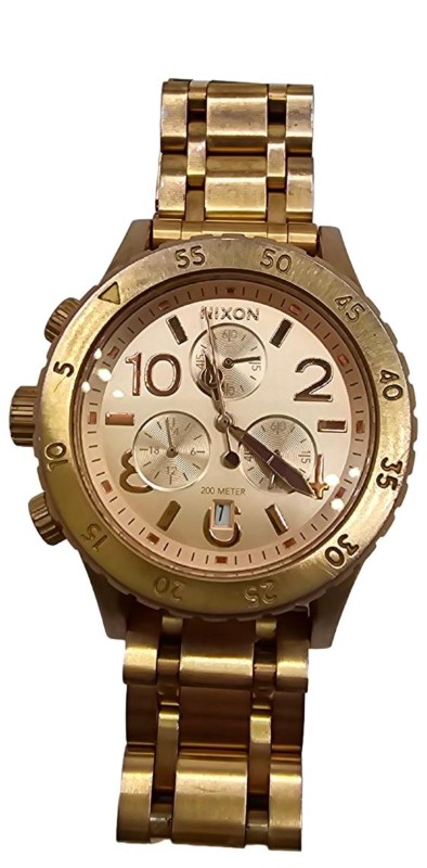 This elegant NIXON the 38-20 ladies' dress watch features a classic circular face with Roman numerals and a gleaming gold-tone metal band. Crafted with attention to detail, this timepiece seamlessly blends style and functionality, making it a versatile accessory for any occasion. Its timeless design and quality construction ensure it will remain a cherished part of your wardrobe for years to come.
