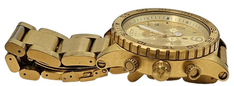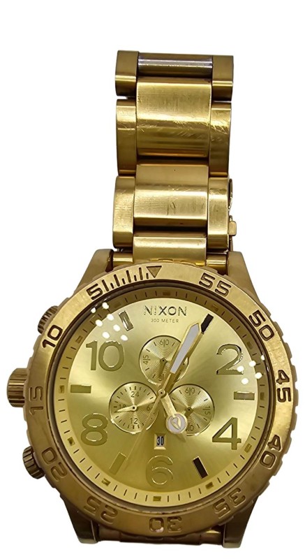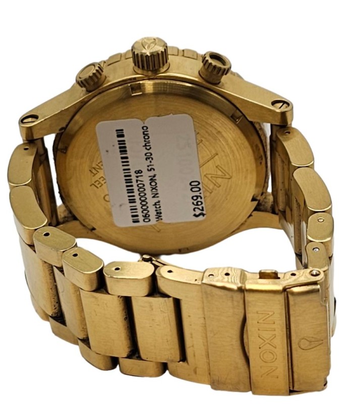 This NIXON 51-30 chrono watch is a sophisticated and timeless dress watch that will elevate any outfit. The gold-toned metal band complements the classic Roman numeral face display, creating a refined and elegant aesthetic. This secondhand timepiece is perfect for the modern gentleman who appreciates quality craftsmanship and a touch of vintage-inspired style.