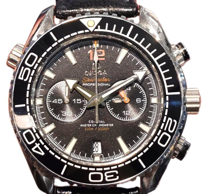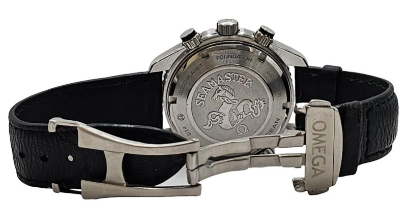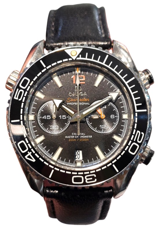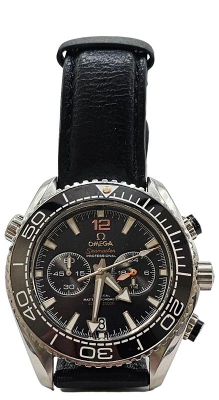This classic OMEGA Seamaster Planet Ocean SI14 watch features a sleek black metal band and a striking black dial with Roman numeral markers. The circular face gives this timepiece a sophisticated, dressy look that is suitable for any occasion. With its durable construction and timeless design, this secondhand OMEGA watch is a versatile accessory that will complement a variety of outfits.