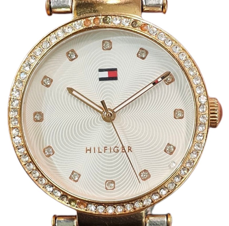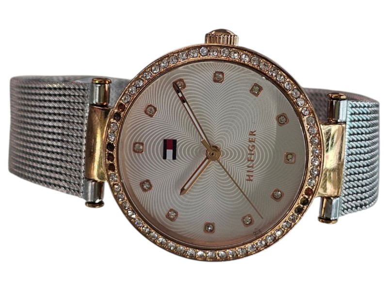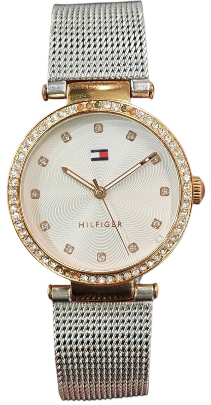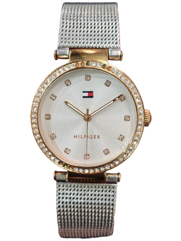 This elegant Tommy Hilfiger ladies' dress watch features a classic silver-toned metal band and a circular face with Roman numeral markers. The timeless design makes it a versatile accessory that can be dressed up or down. With its reliable quartz movement and durable construction, this pre-owned watch is a practical and stylish choice.