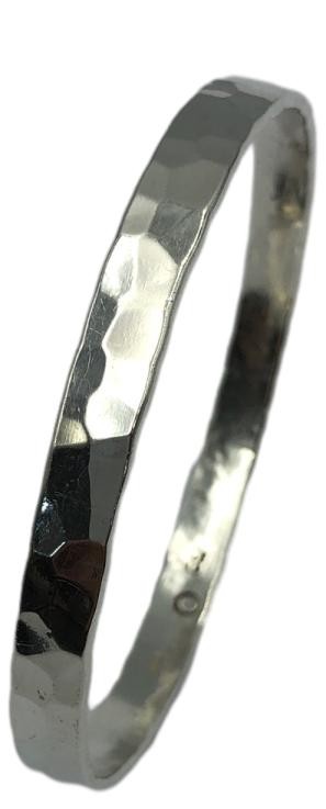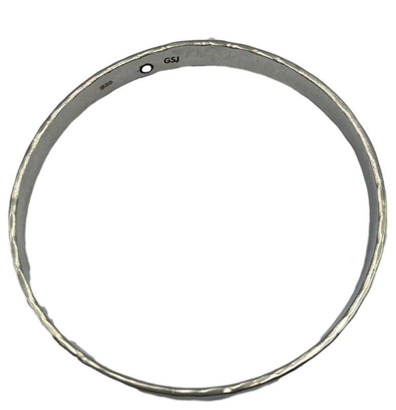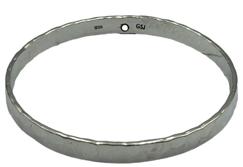 This captivating 925 silver bangle showcases an eye-catching flat patterned design. Crafted from 24.01g of sterling silver, it features a hallmark of 925 and engraving of 925/GSI, confirming its quality. The bangle's flat shape and hammer-textured finish lend it a distinctive, modern aesthetic. At 6.5cm wide, this versatile bracelet is a stylish addition to any jewellery collection. All sizes and measurements are approximate.