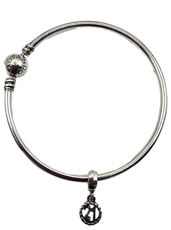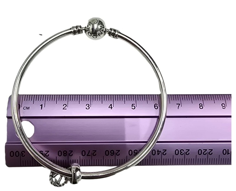 Crafted in 925 sterling silver, this Pandora bangle is a timeless unisex accessory. The engraved detail 'ALE 925' adds a subtle and sophisticated touch. Weighing 11.13 grams, this sleek silver bangle is a versatile piece that can be worn alone or stacked with other bracelets for a refined look. All sizes and measurements are approximate.
