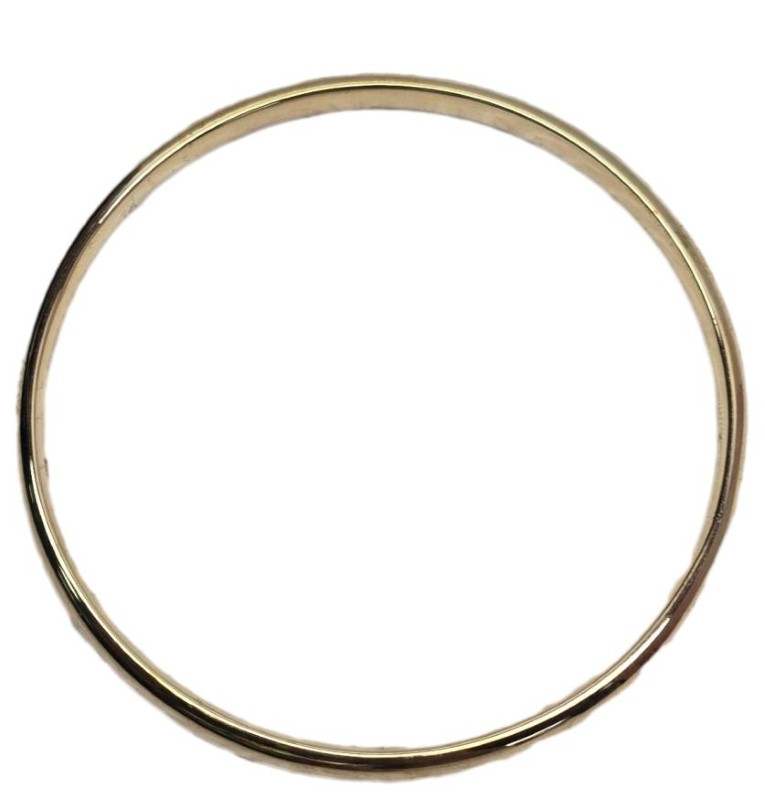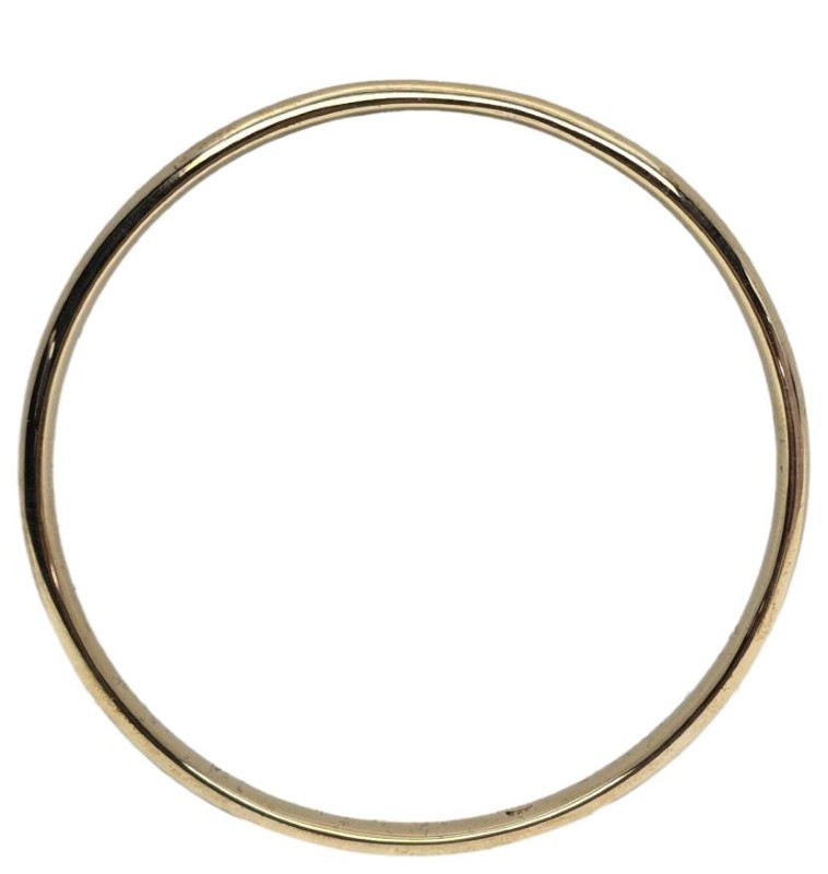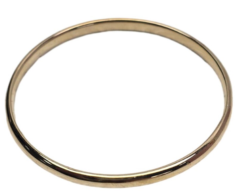 This elegant 9 Karat yellow gold bangle is a timeless ladies accessory. Hallmarked at .375, the solid bracelet features a uniform shape and measures 6.5 cm in both length and width, weighing a substantial 29.43 grams. Crafted from premium yellow gold, this classic bangle design is a versatile wardrobe staple. All sizes and measurements are approximate.