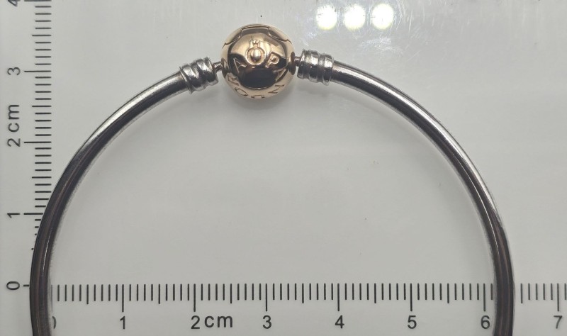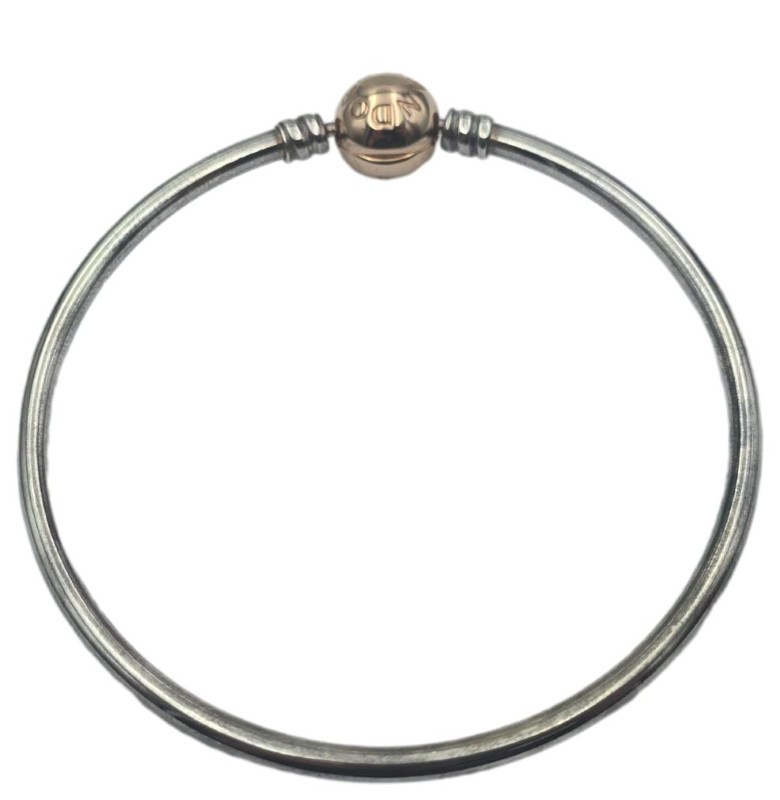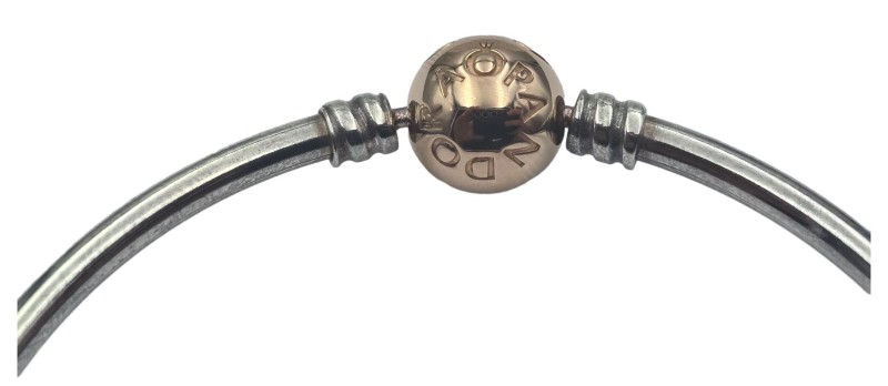 Elegant silver bangle by Pandora. This stylish ladies bracelet features a metal clasp engraved with the letters "ALE MET". Crafted from sterling silver, the sleek, open design weighs a comfortable 9.08 grams. An eye-catching accessory to complement any outfit. All sizes and measurements are approximate.