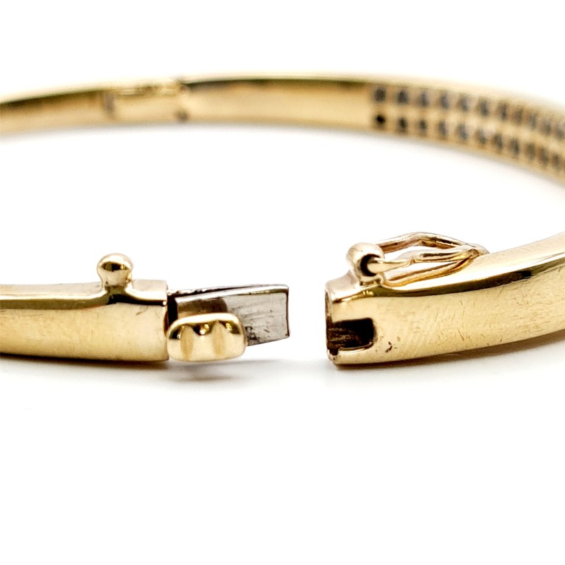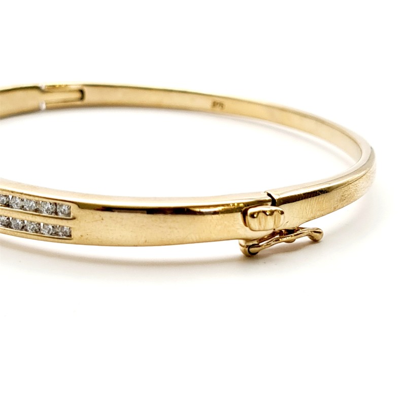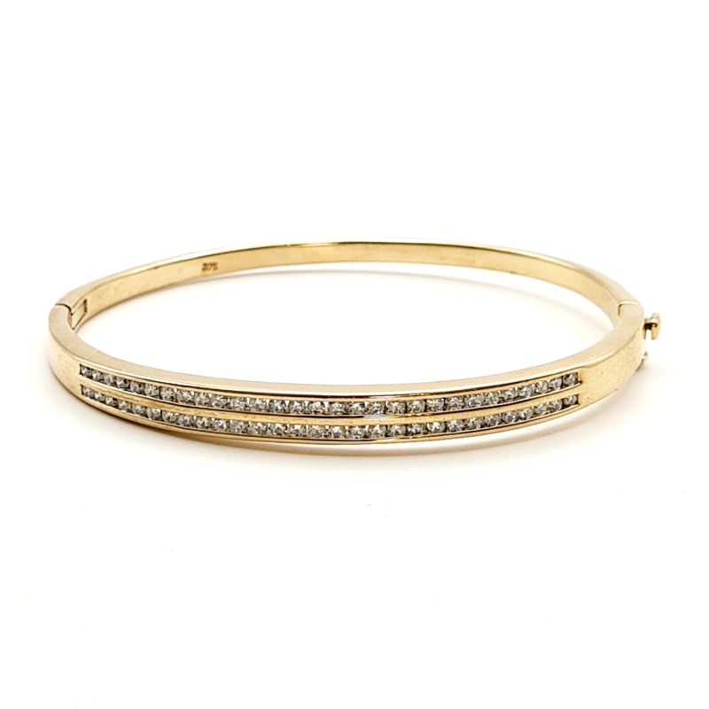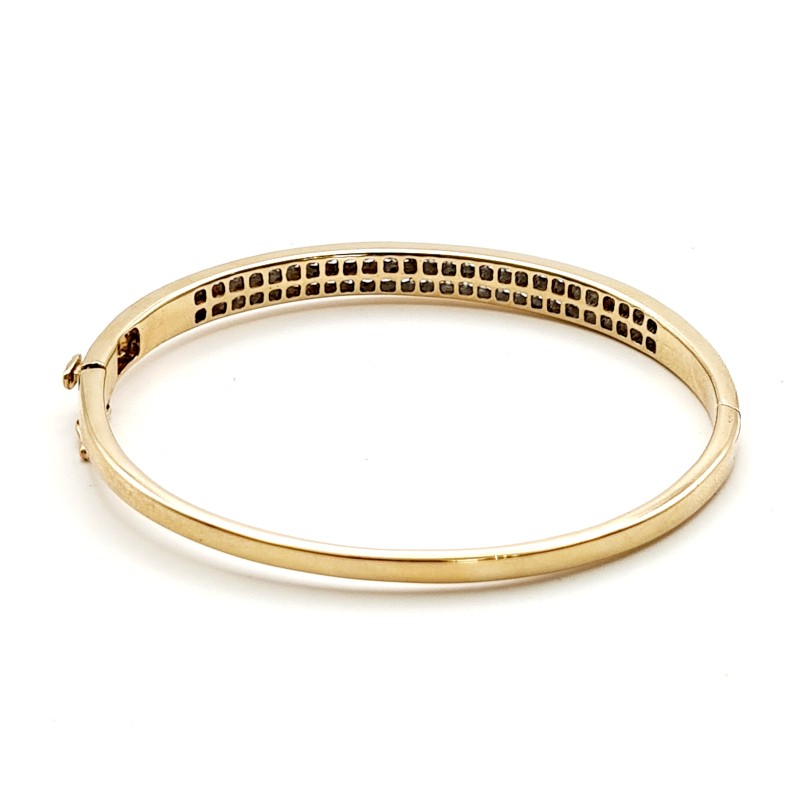 9CT YELLOW GOLD 58 STONE DIAMOND BANGLE. 58 ROUND BRILLIANT CUT DIAMONDS CHANNEL SET IN 2 ROW OVAL HINGED 1/4 ROUND 5.88 - 3.20MM BANGLE WITH CONCEALED BOX CLASP WITH FIGURE OF 8 SAFETY CATCH.