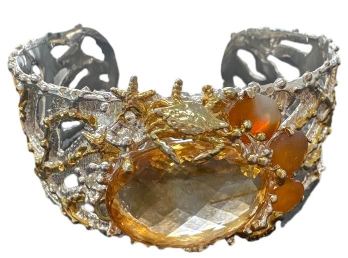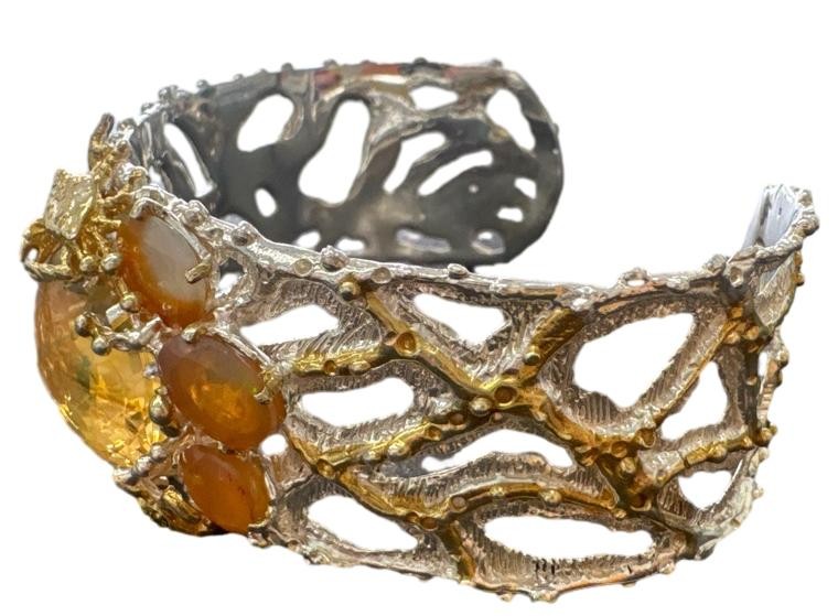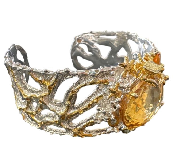 This stunning 925 silver bangle features a captivating mix of gemstones, including citrine, fire opal, peridot, and aquamarine. The silver material provides a sleek, modern look, with the colourful stones adding a vibrant touch. Weighing 60.08 grams, this ladies' bracelet is a versatile accessory that can be worn for any occasion. All sizes and measurements are approximate.