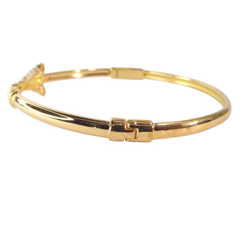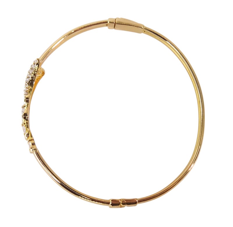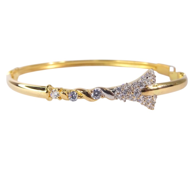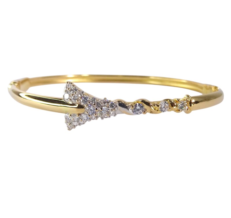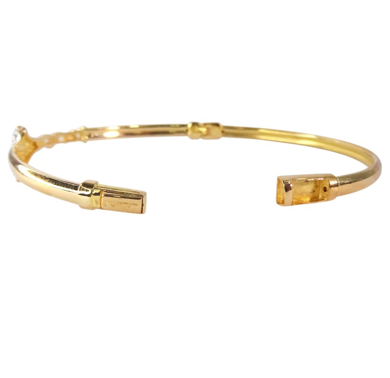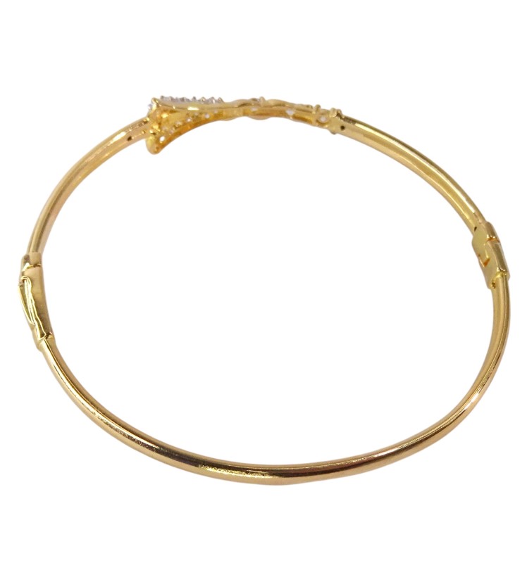 Crafted in 22K yellow gold, this elegant ladies' bracelet features a captivating clear stone hinged bangle design. The hinged construction provides a secure and comfortable fit, while the 22-karat material ensures exceptional quality and durability. Weighing a substantial 11.39 grams, this versatile accessory seamlessly transitions from day to night, effortlessly complementing a variety of outfits and occasions.