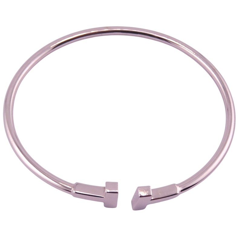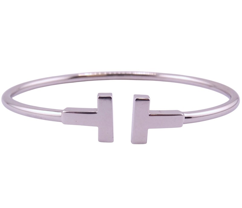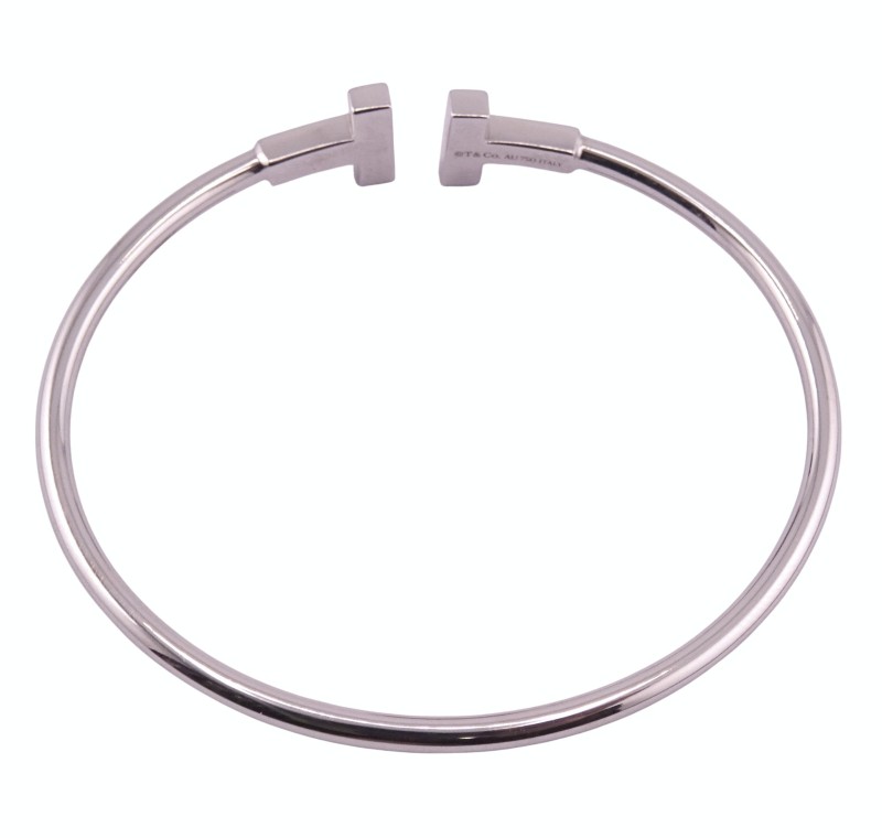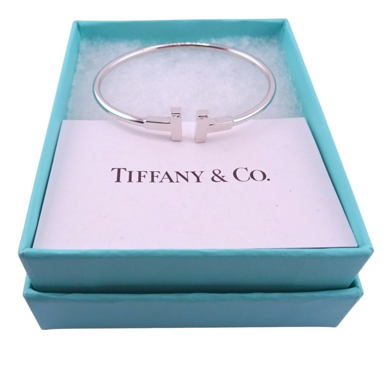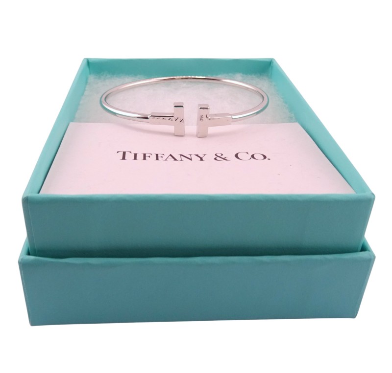 Crafted in luxurious 18k white gold, this elegant Tiffany & Co bangle bracelet is a timeless accessory for the modern woman. The hallmarked .750 purity guarantees the highest quality and craftsmanship. Weighing a substantial 3.32 grams, this sophisticated white gold bangle exudes refined style and sophistication.