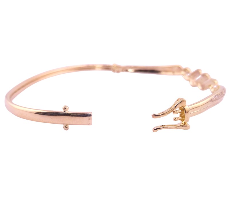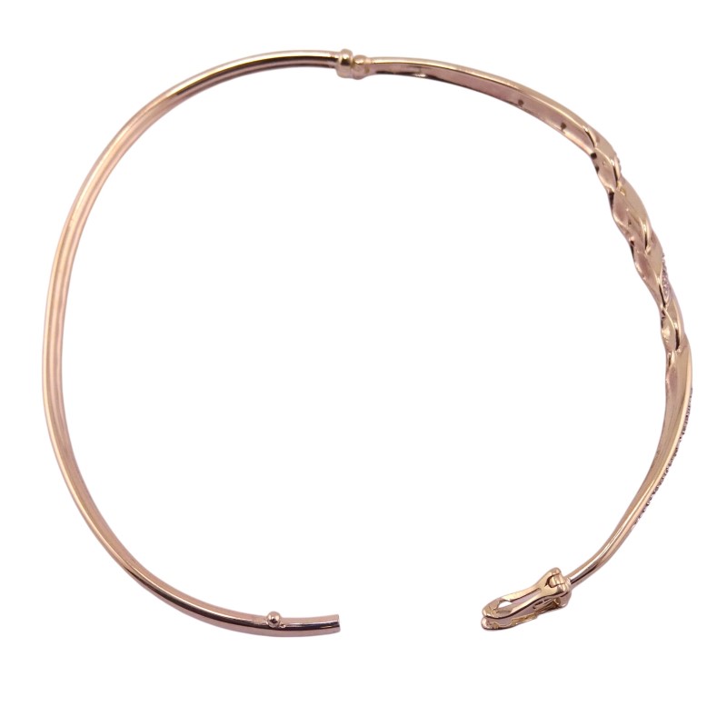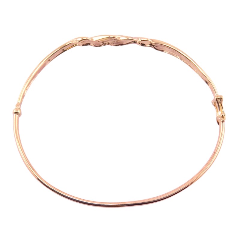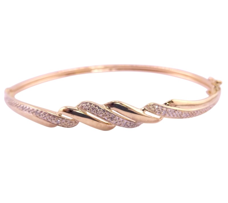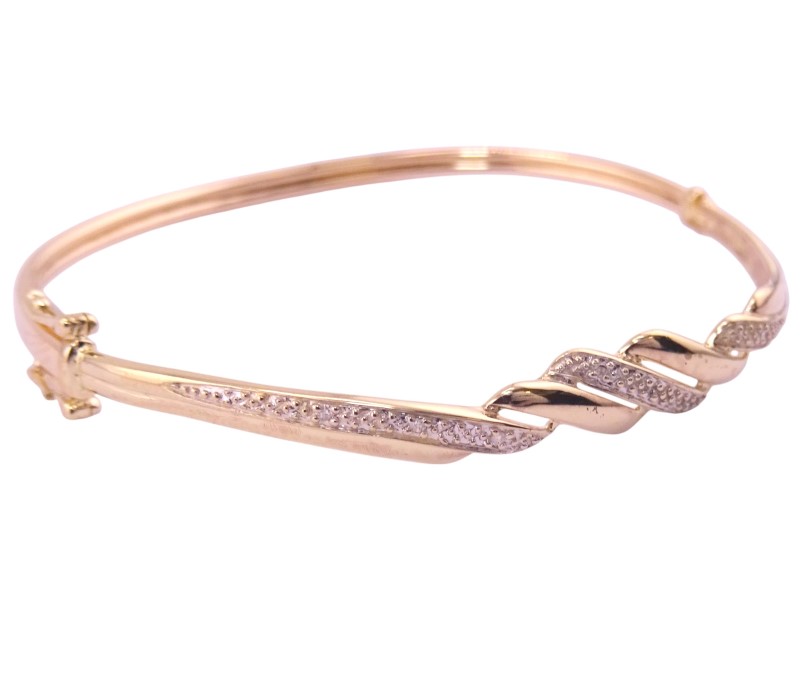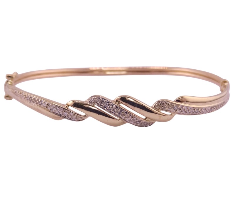 This elegant 9 karat yellow gold hollow bracelet features a captivating twisted two-tone pattern. The bangle's striking convertible design allows for versatile wear, with the option to convert it into a statement piece. Hallmarked at .375, this bracelet weighs a substantial 4.87 grams and measures 6.3 cm in length.