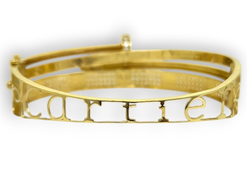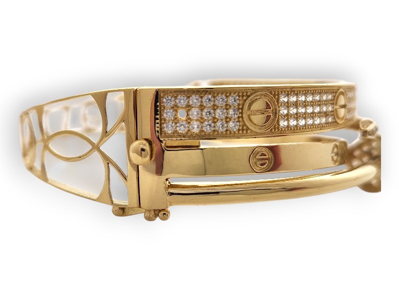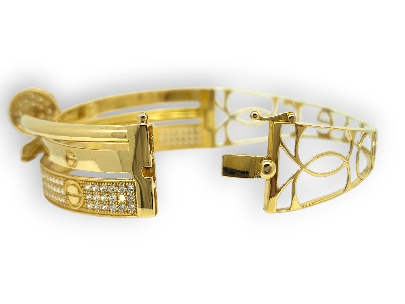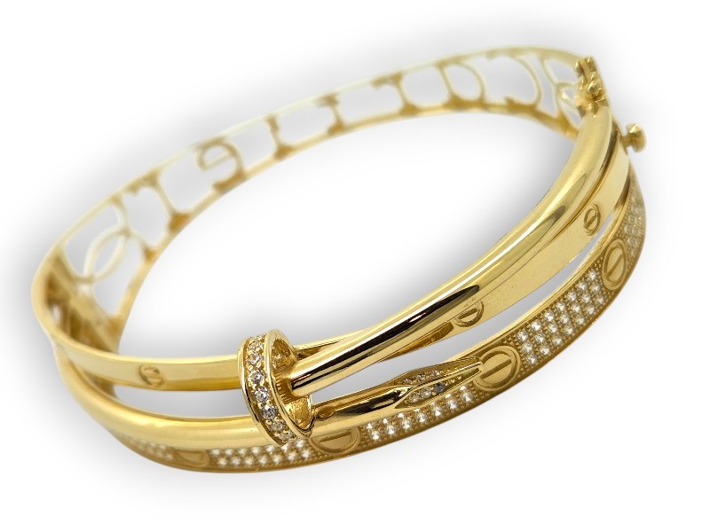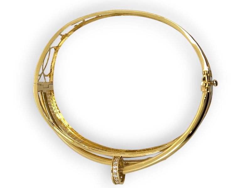 This 18k yellow gold bangle features a screw-secured wrap around design adorned with multiple clear stones (Cubic Zirconia), with one stone missing. The bangle is hallmarked 750 and also has an engraved '18' marking. Measuring 6.5cm in length and 5.5cm in width, this 17.75g piece has a pave stone setting. All sizes and measurements are approximate.