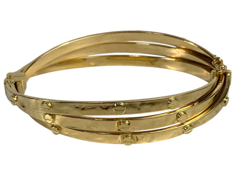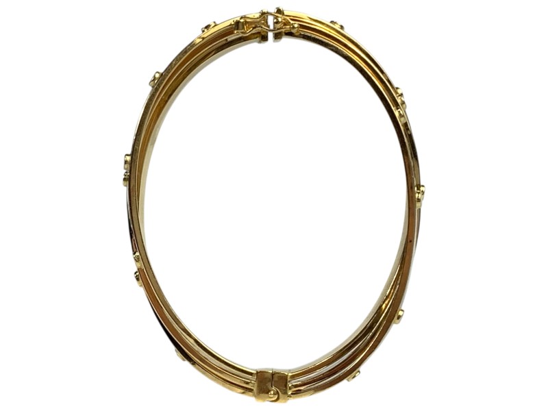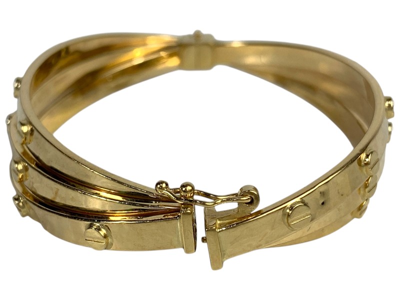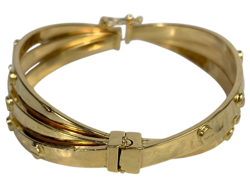 Description: 18CT YELLOW GOLD HINGED BANGLE WITH FIGURE 8 - HOLLOW AND DENTED