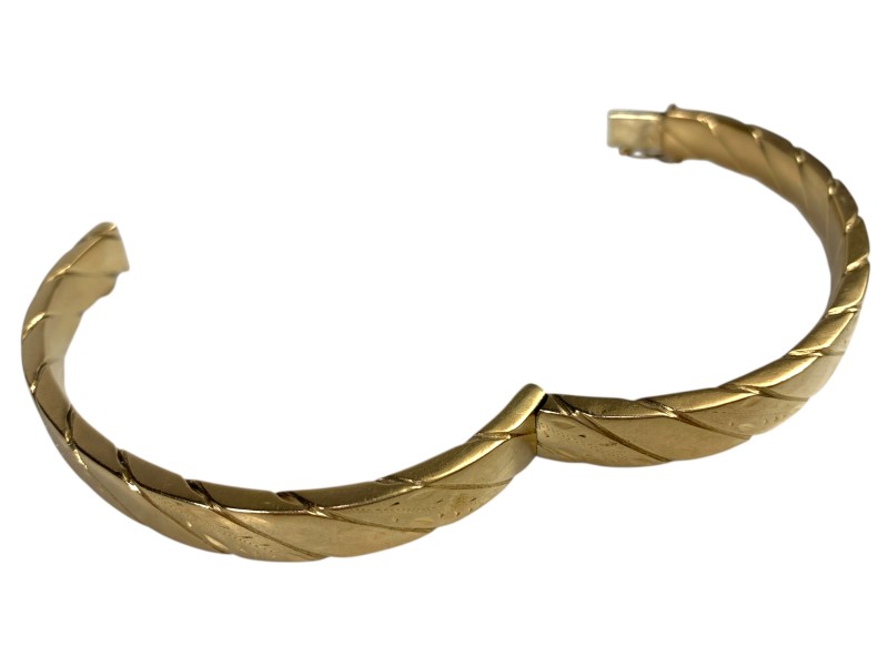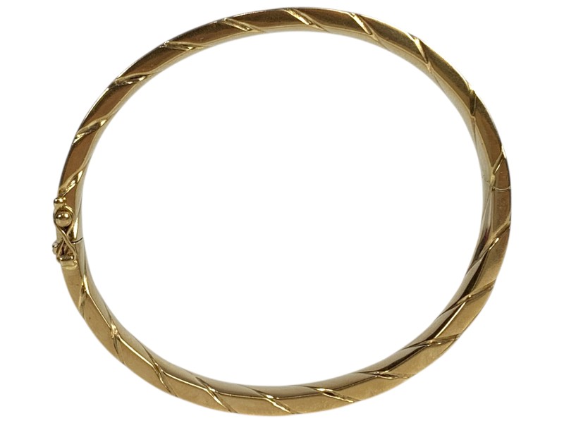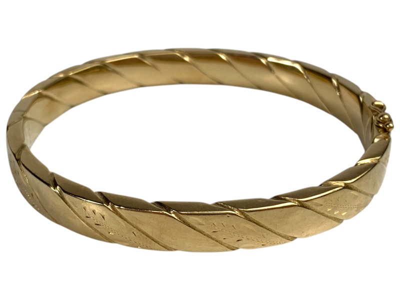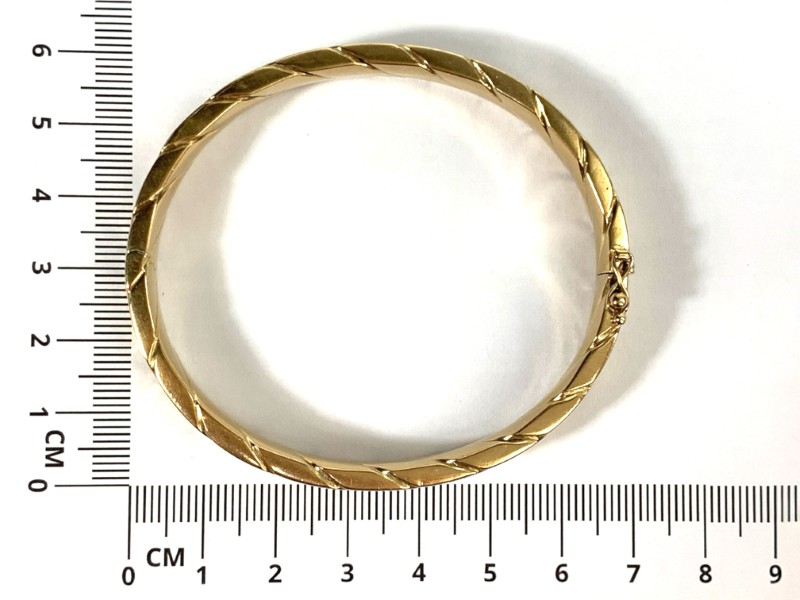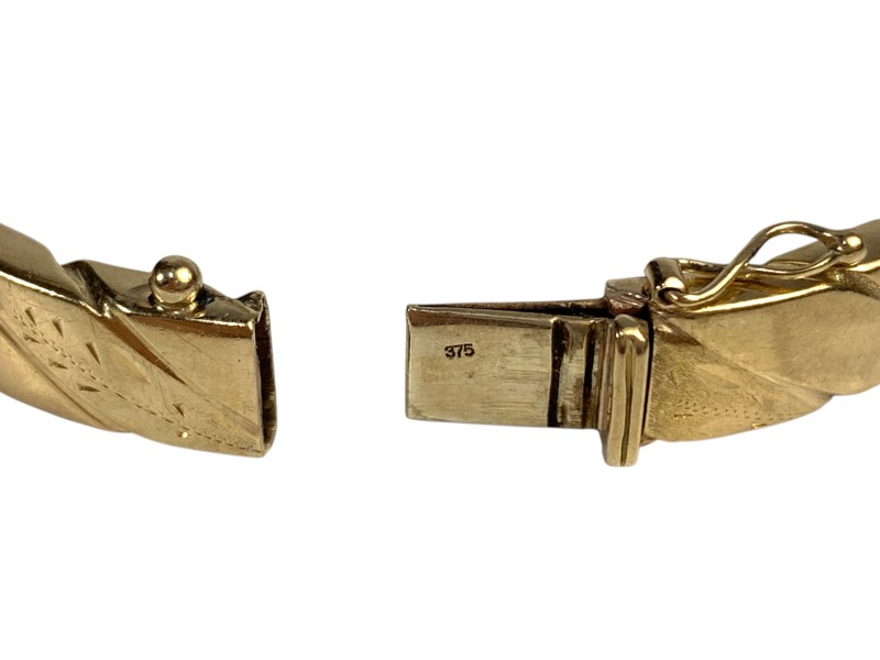 Description: 9CT YELLOW GOLD HOLLOW BANGLE WITH FIGURE 8 SAFETY CLASP - SOME DENTS