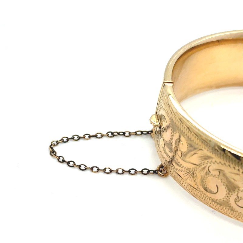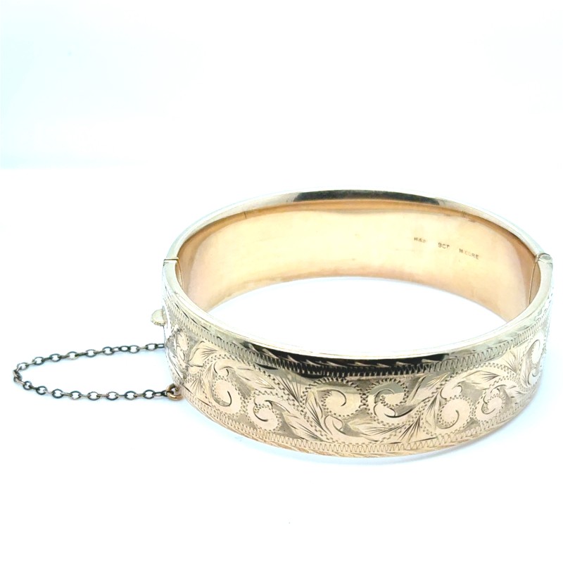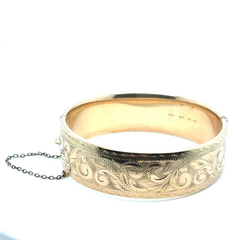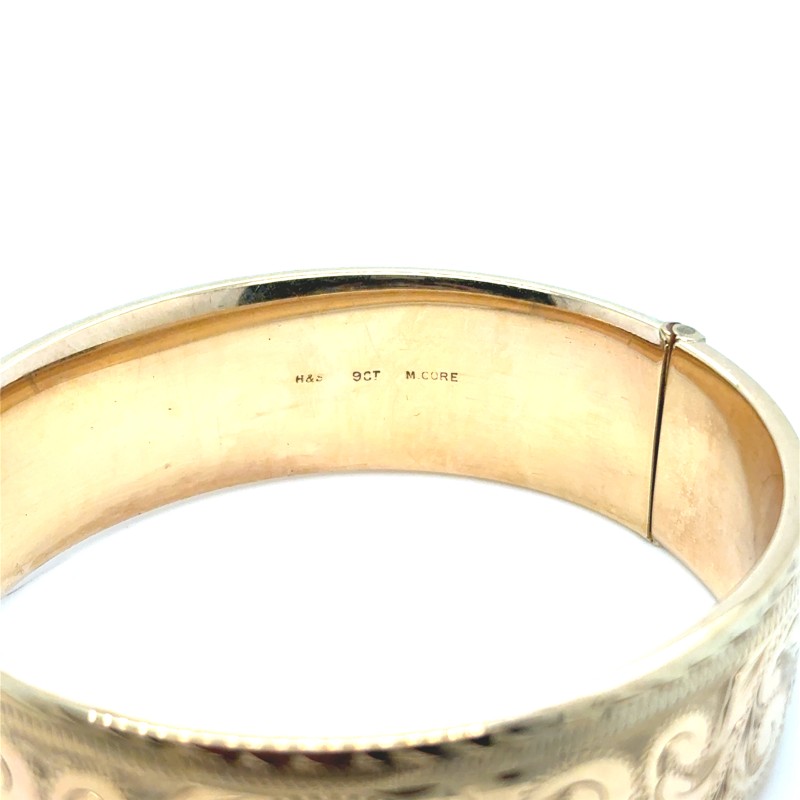 Make / Model: Rolled 9ct Yellow Gold On Metal Core, Scroll Engraved Wide Hinged Oval Bangle