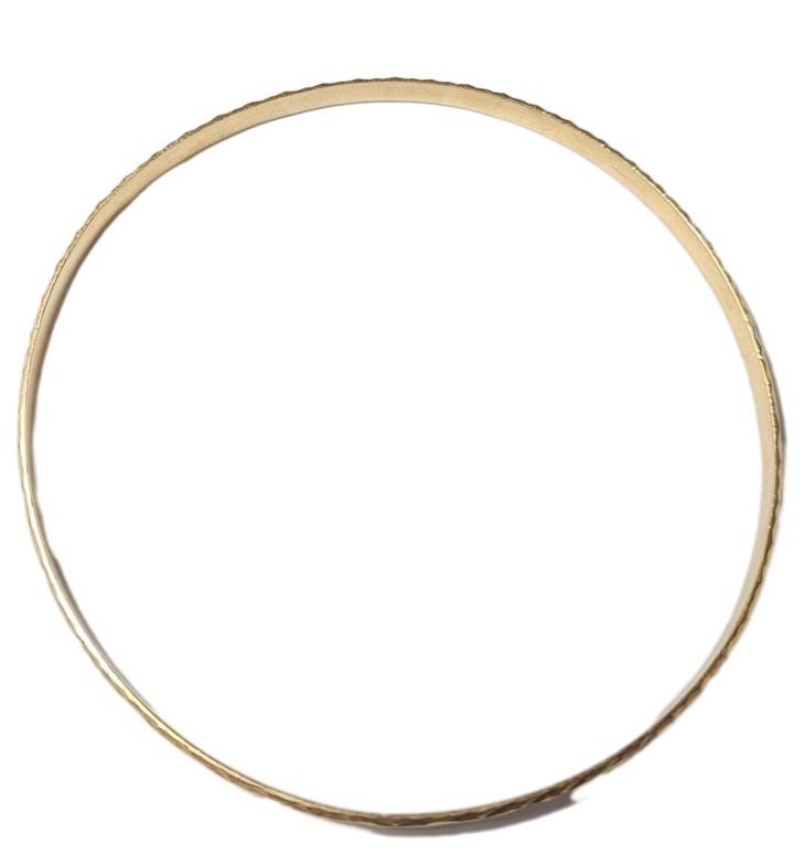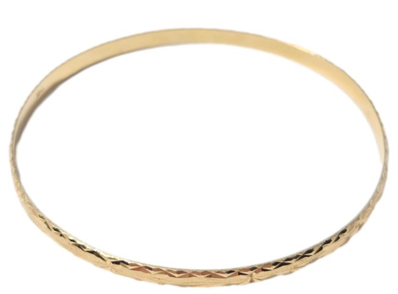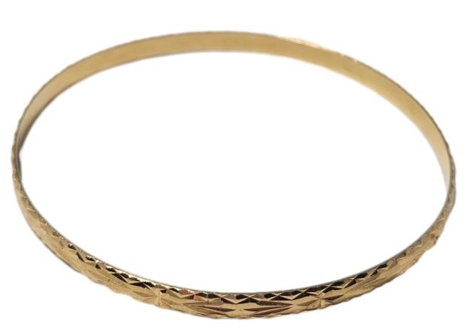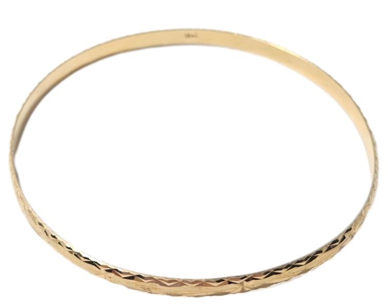 This stunning 18-karat yellow gold bangle features a chic patterned design, perfect for adding a touch of elegance to any outfit. Crafted with a hallmark of .750, this ladies' bracelet has a length of 7 cm and a width of 7 cm, weighing in at a substantial 10.42 grams. The patterned shape creates a visually interesting and textured piece that is sure to draw admiring glances. All sizes and measurements are approximate.