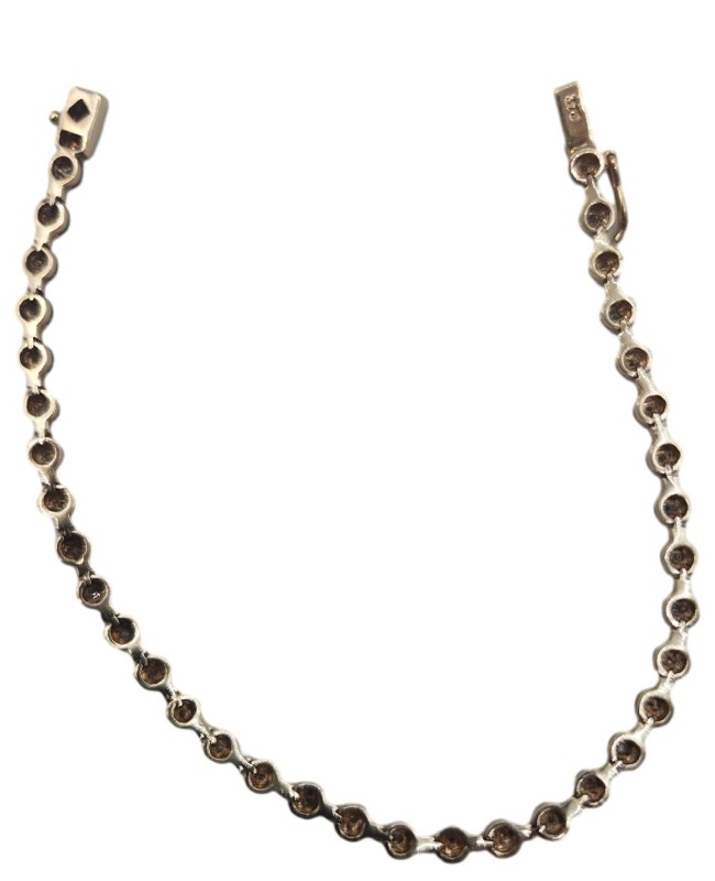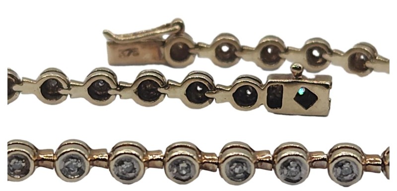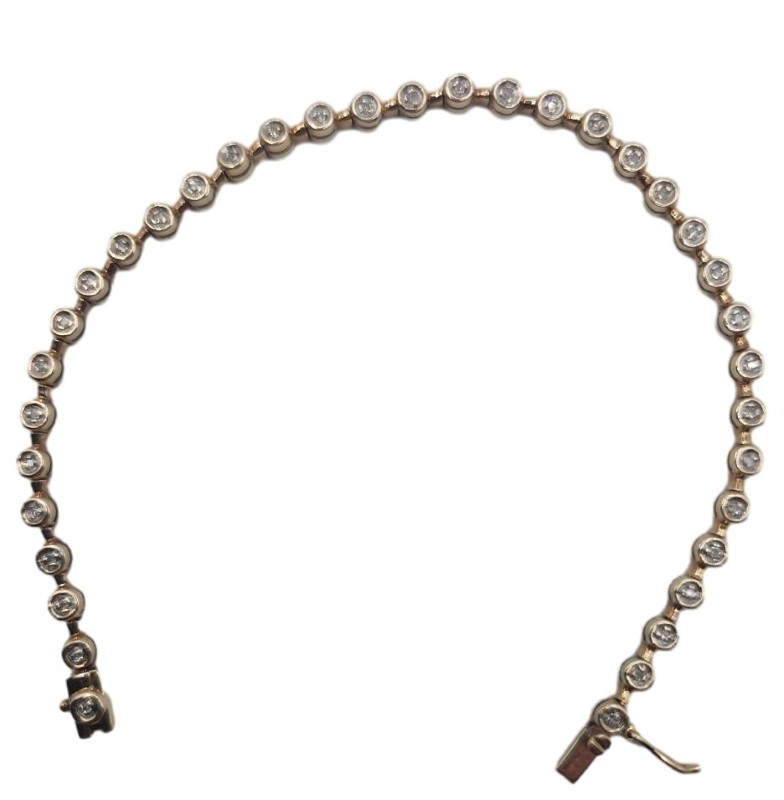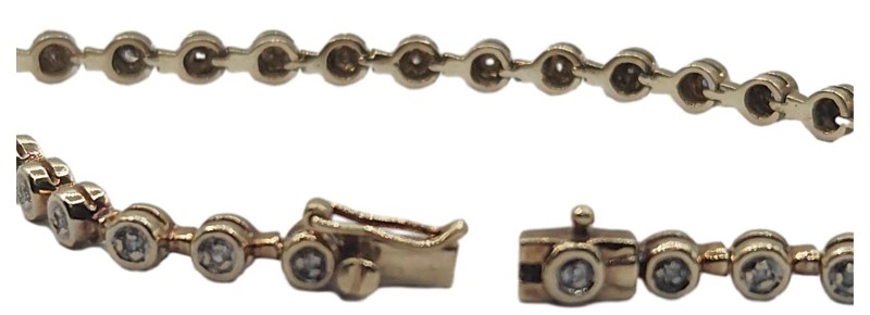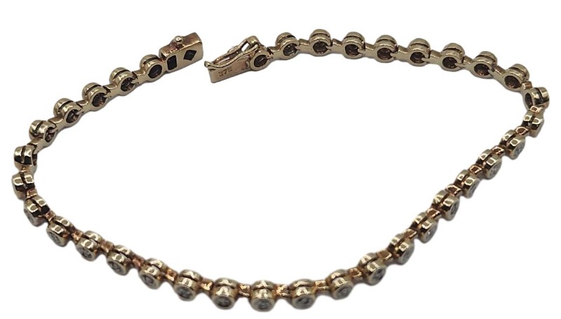This elegant 9ct yellow gold vintage tennis bracelet features a row of 36 sparkling bezel set diamonds, weighing a total of approximately 7.03 grams. Measuring 17.5cm in length and 0.3cm in width, this versatile accessory is crafted with a hallmark of .375, ensuring quality and authenticity. A classic ladies' bracelet design, perfect for adding a touch of timeless glamour to any outfit.