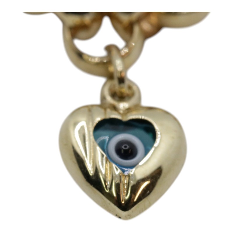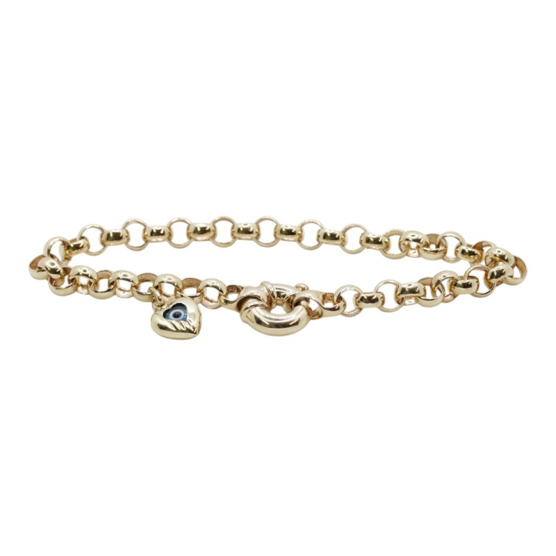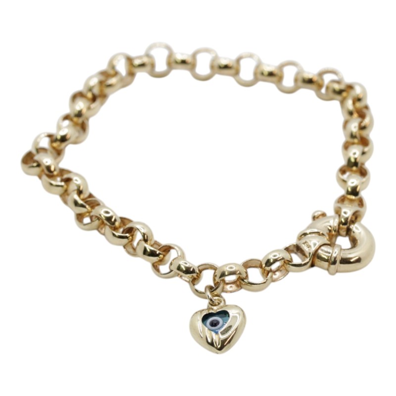 This stylish 9ct yellow gold belcher bracelet features a captivating evil eye charm. Crafted with a classic belcher link design, the bracelet measures 19.2cm in length and weighs a substantial 10.5g. The 9 karat purity is hallmarked .375, ensuring the quality and authenticity of the precious metal. A versatile accessory, this bracelet is suitable for ladies. All sizes and measurements are approximate.