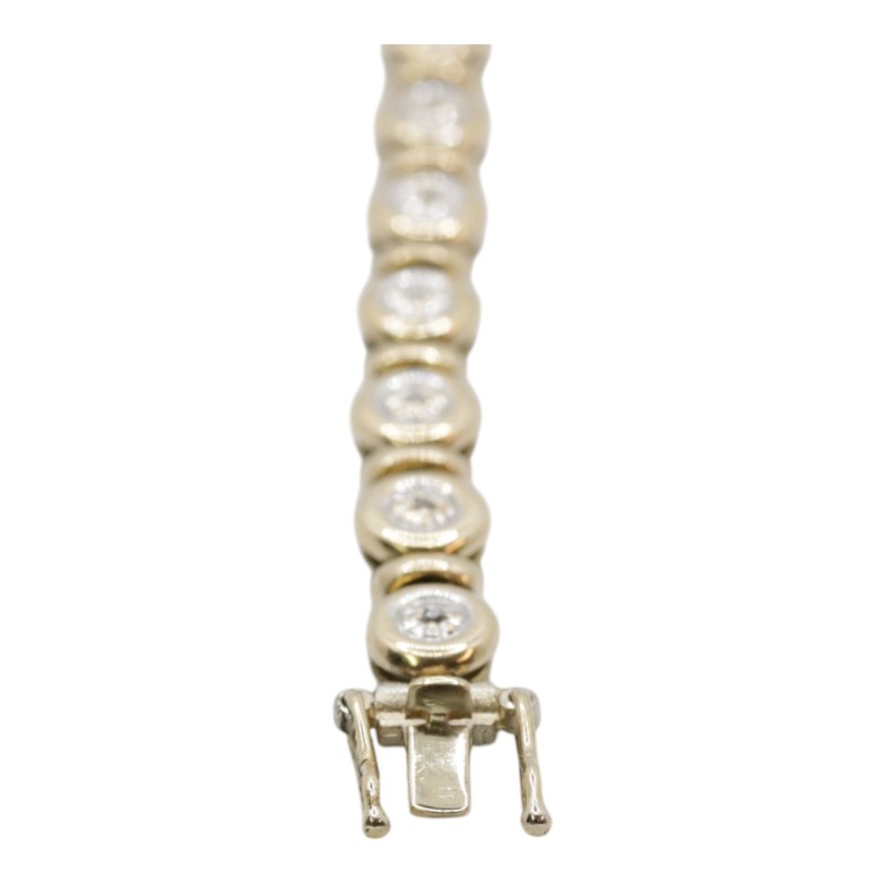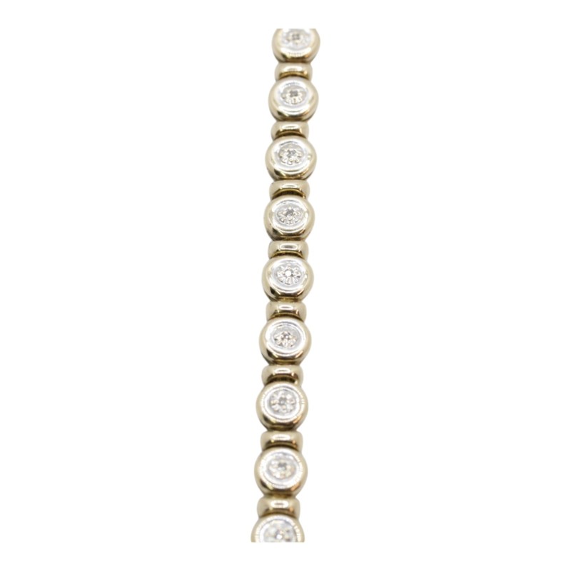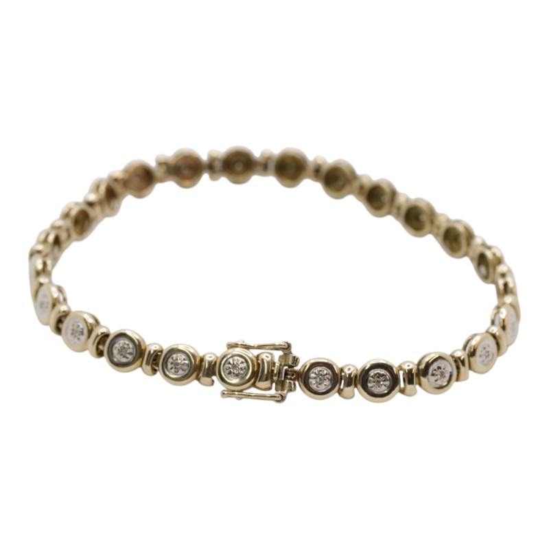 This 9k yellow gold bracelet features a classic tennis design, showcasing a row of sparkling diamonds that add a touch of elegance. Crafted with precision, the bracelet measures 19cm in length and 0.5cm in width, with a total weight of 10.47g. The hallmark of .375 ensures the quality and purity of the 9k yellow gold material. All sizes and measurements are approximate.