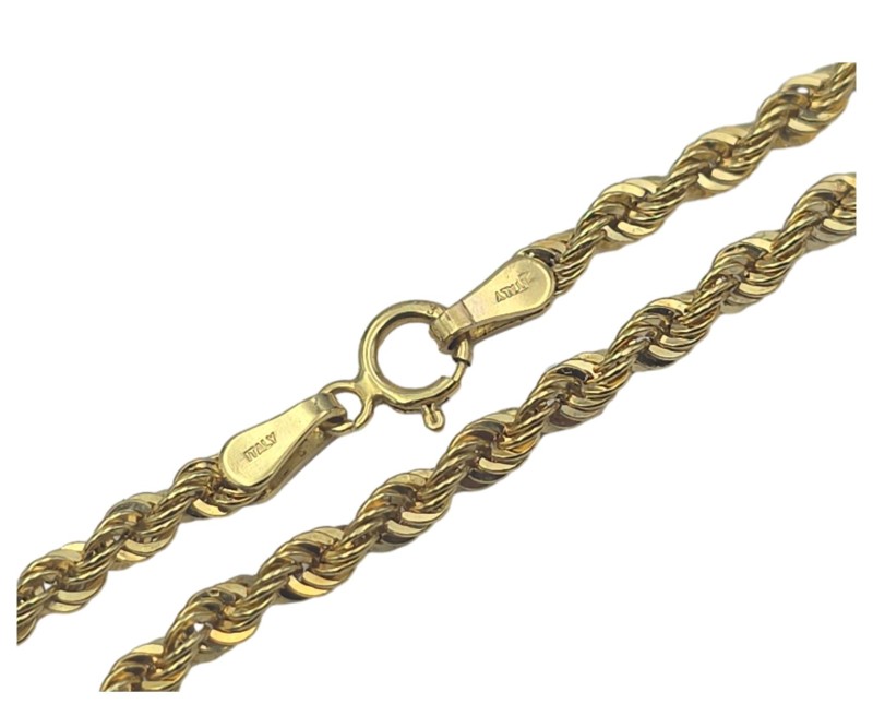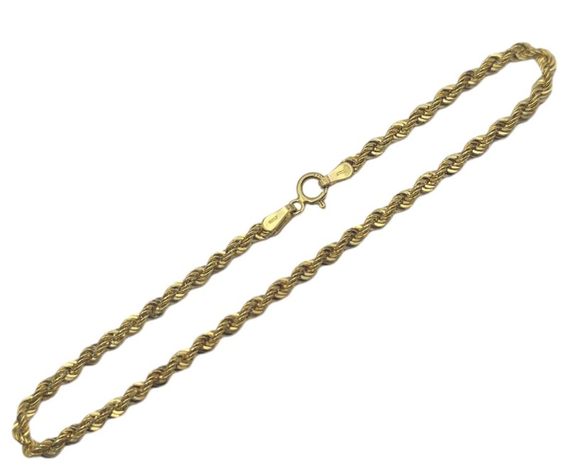 This elegant 10 Karat yellow gold rope bracelet is a timeless accessory that exudes sophisticated style. Crafted from 417 hallmarked yellow gold, the bracelet features a classic rope design with a length of 19 cm and a weight of 1.35 grams, making it a delicate and versatile piece suitable for everyday wear. The bracelet's refined appearance and high-quality construction make it a chic choice for the modern lady. All sizes and measurements are approximate.