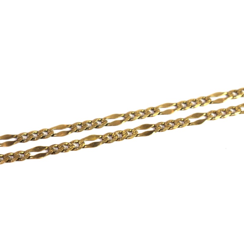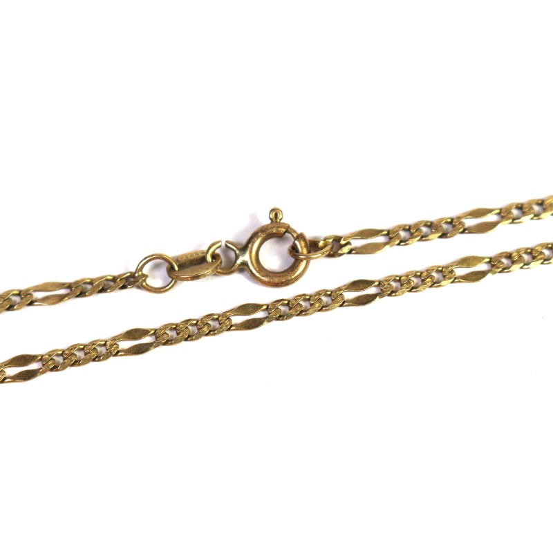 This 9 karat yellow gold figaro bracelet exudes a timeless elegance. Crafted in Italy, the bracelet features the hallmark .375 stamp, ensuring its quality. Measuring 19.1 cm in length and weighing a substantial 1.43 grams, this versatile piece can be worn by anyone. The classic figaro chain design adds a sophisticated touch, making this bracelet a sophisticated and durable accessory. All sizes and measurements are approximate.