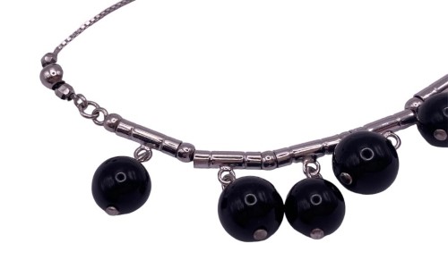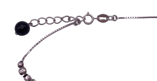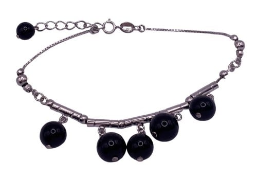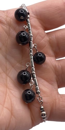 Ladies sterling silver bracelet with dainty box links of chain with bar & ball links & dangly black stone drops. Some light surface wear may be visible