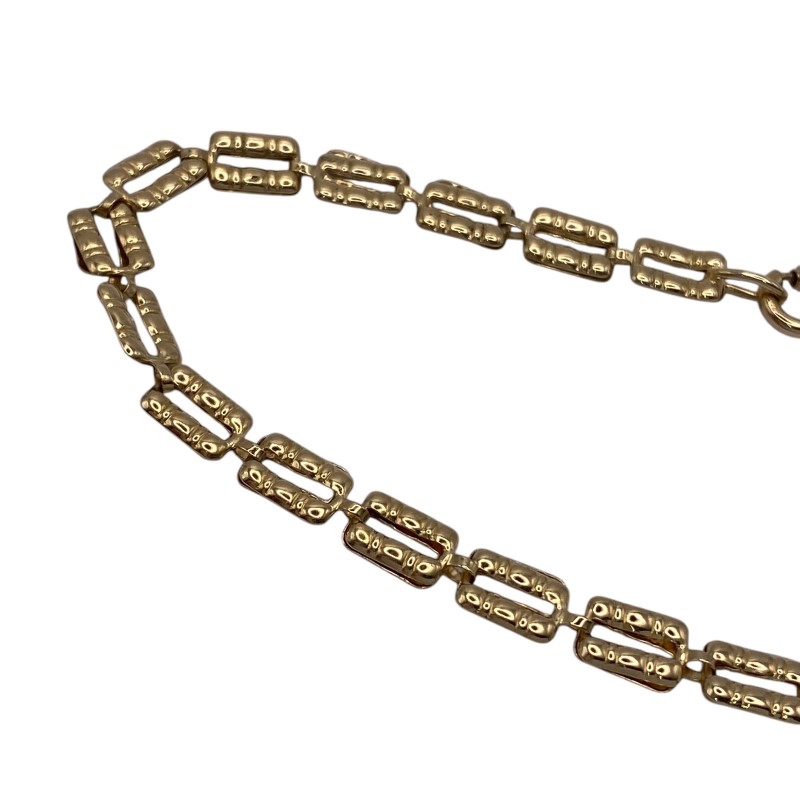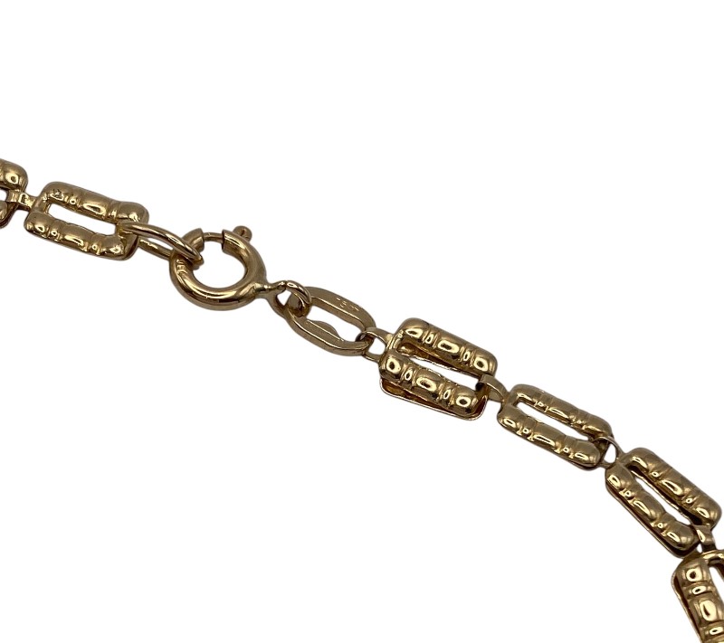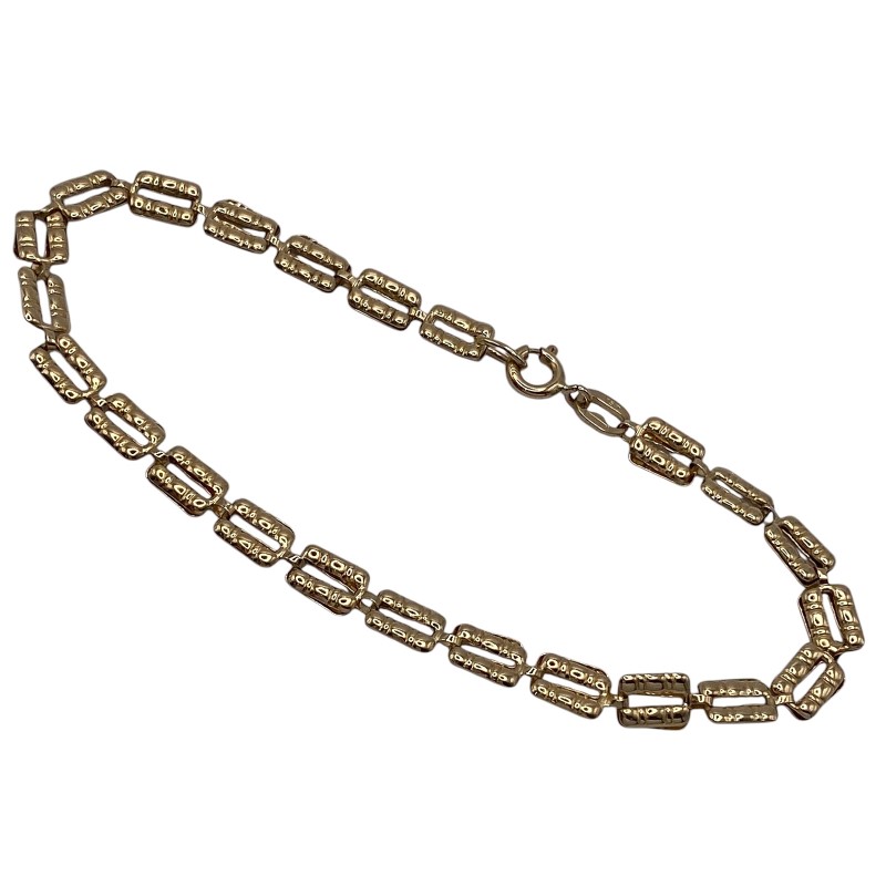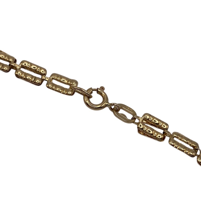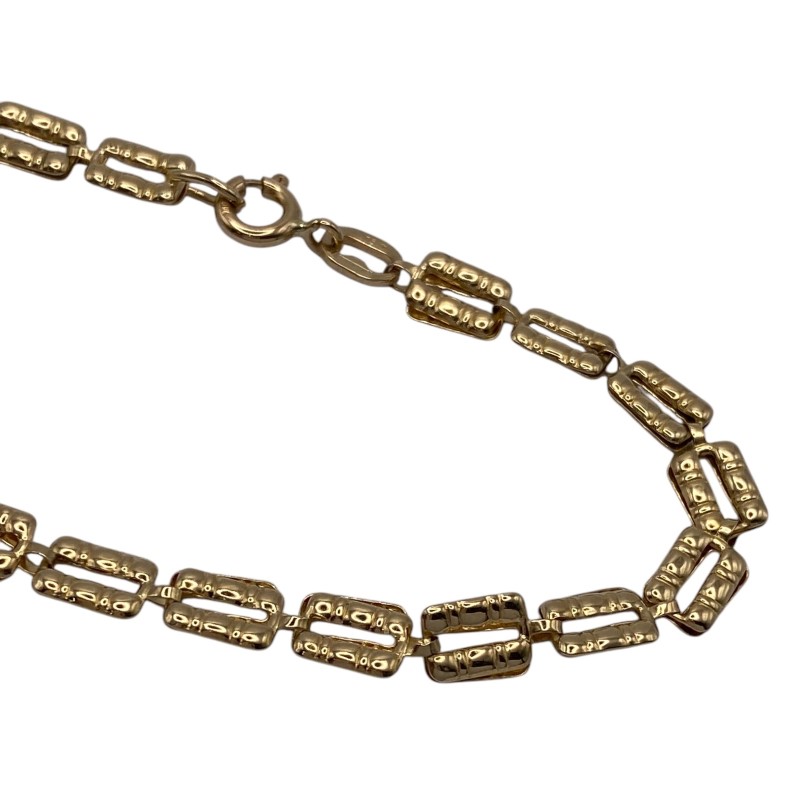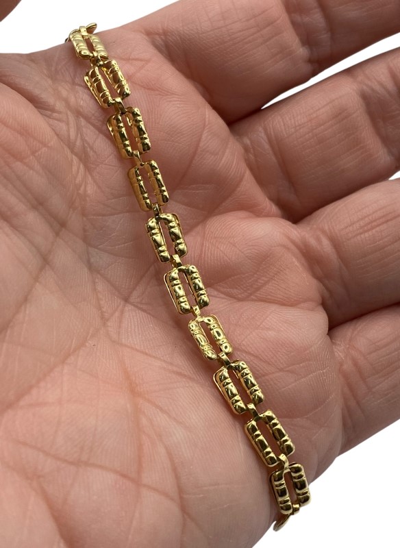 Hollow patterned links of 18ct yellow gold create this unique gold bracelet with links that fold over interlocking through the previous link. Some visible wear to the links, some show signs of being squashed, some visible surface wear.