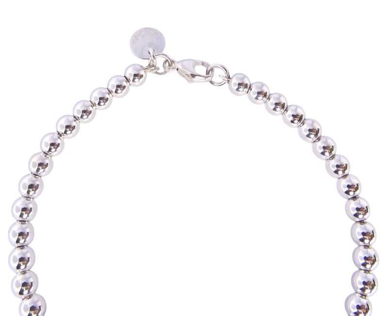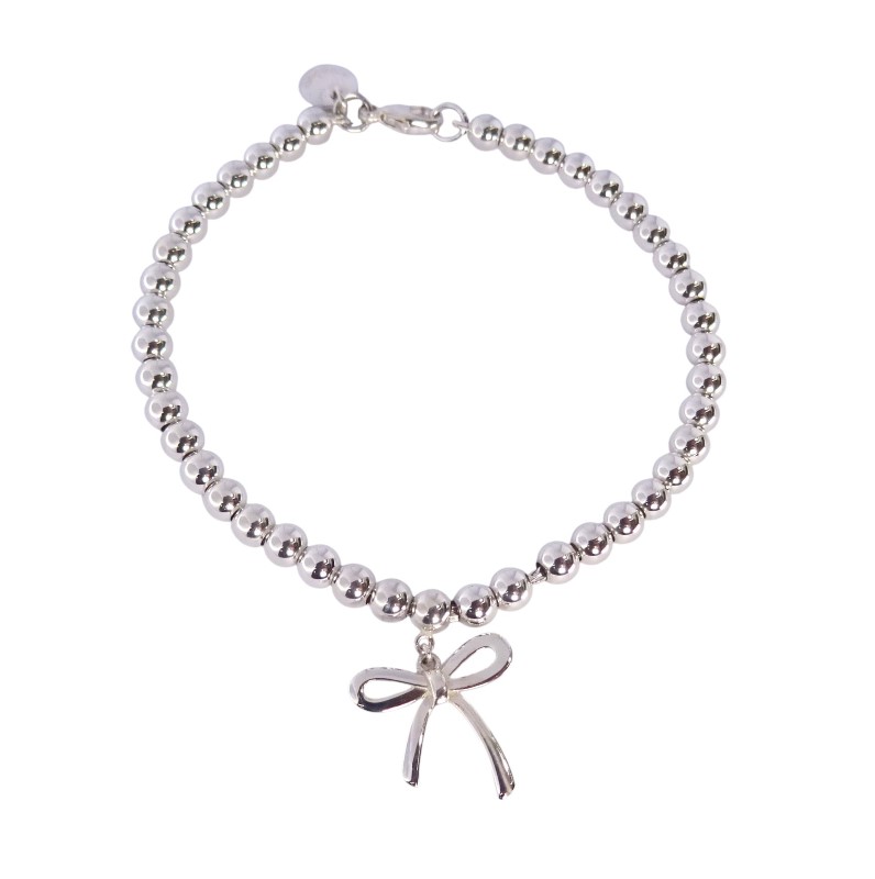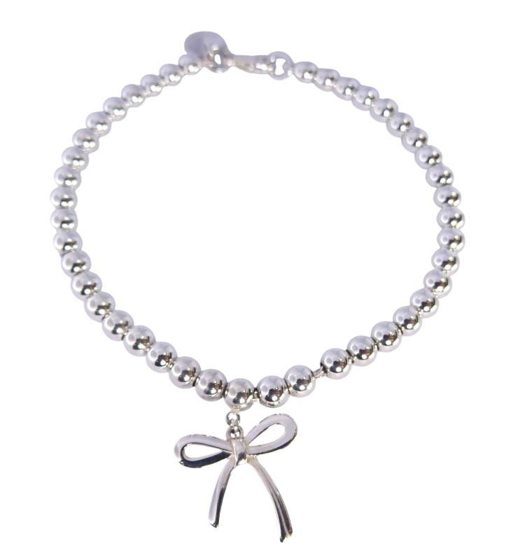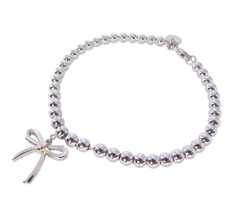 This elegant Tiffany & Co. bracelet features a chic bow charm and beaded design crafted in 925 sterling silver. Measuring 16.5 cm in length and 0.4 cm in width, this ladies' accessory has a delicate yet sophisticated aesthetic, weighing a lightweight 5.57 grams. The timeless silver tone makes this bracelet a versatile piece that can be dressed up or down to suit any occasion.
