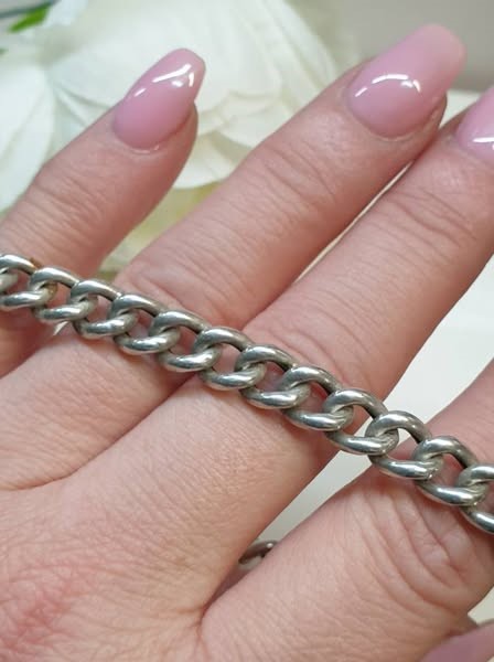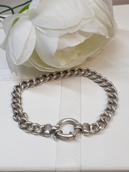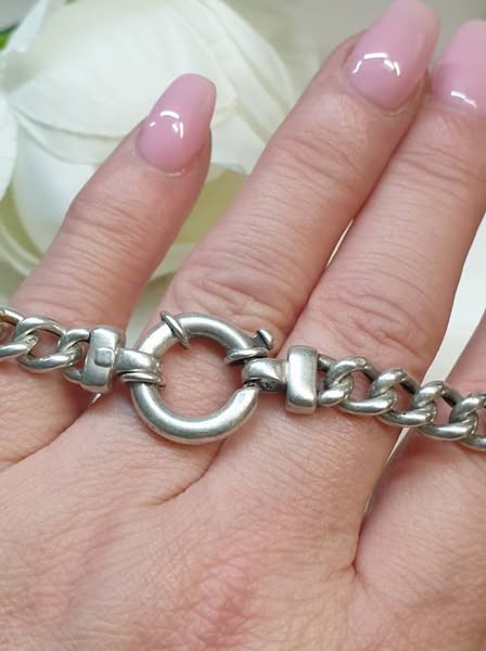 This 925 silver curb link bracelet is a classic accessory for any lady's wrist. Crafted from solid silver, the bracelet features a bold and stylish curb link design that measures 20cm in length and 0.7cm in width, weighing a substantial 14.66 grams. The SILVER BOLT RING BRACELET CURB LINK offers a timeless and versatile look that can be dressed up or down to suit any occasion. All sizes and measurements are approximate.