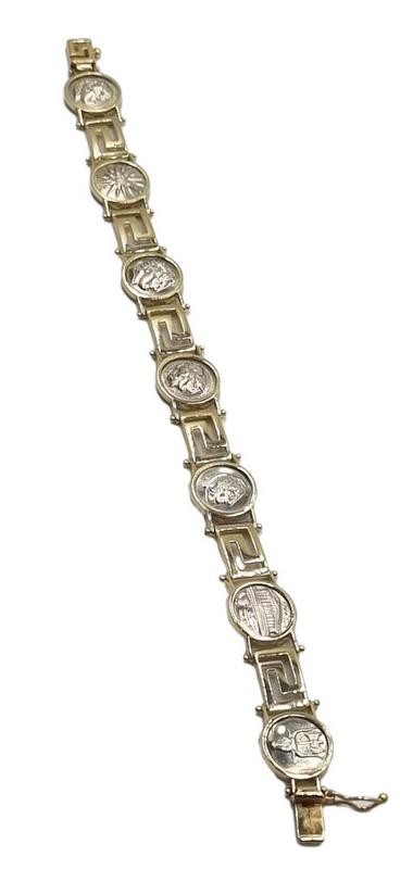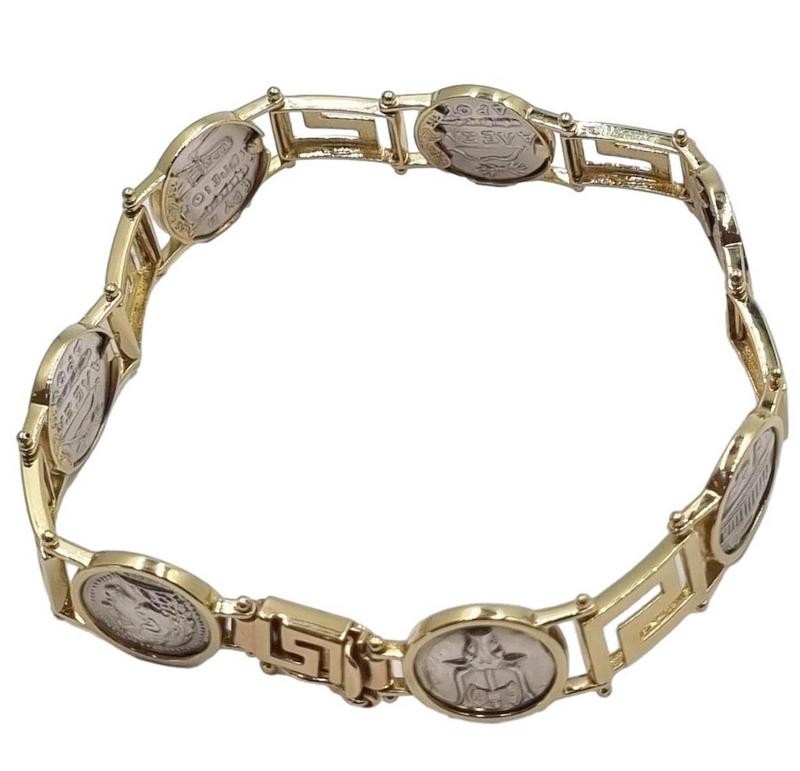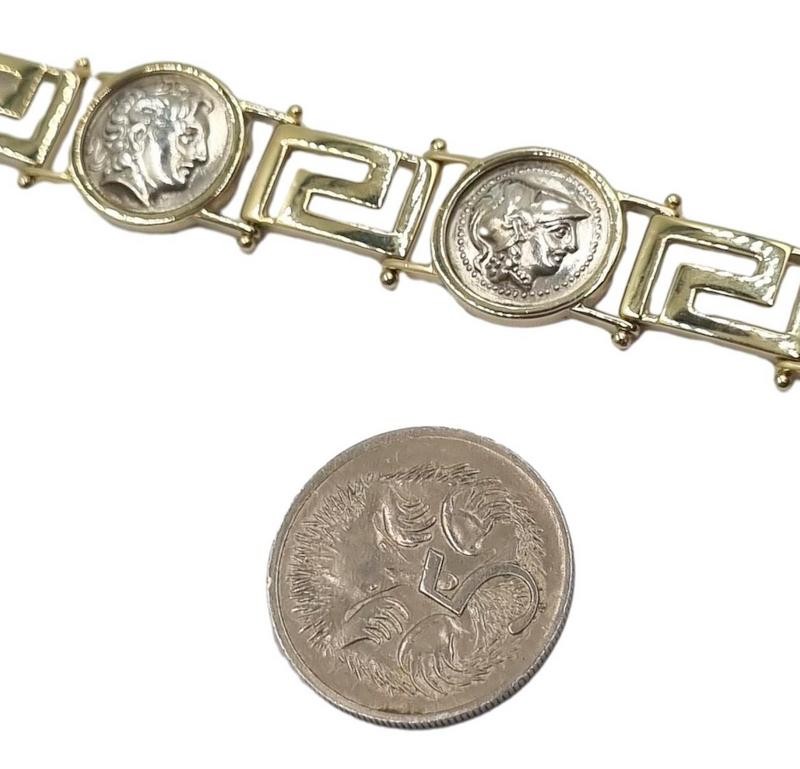 This 14ct yellow and white gold bracelet features a replica Ancient Greek coin design. Crafted from 14ct (.585) gold, the bracelet measures 19cm in length and weighs a substantial 19.94g. The distinctive coin motif adds a unique touch of antique-inspired style to this versatile gold accessory.