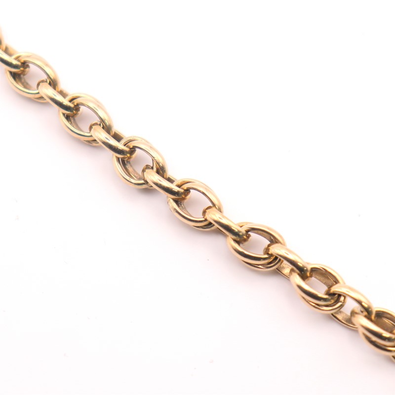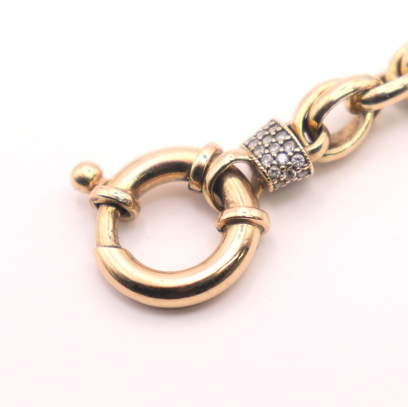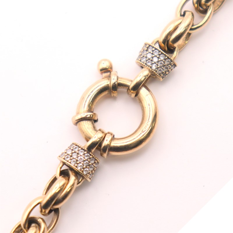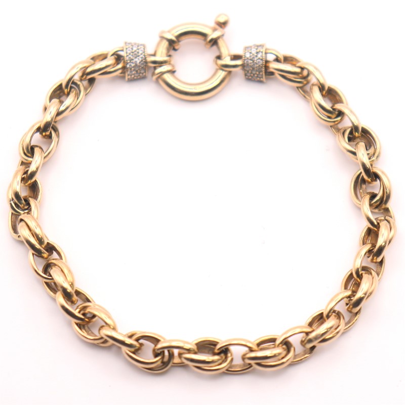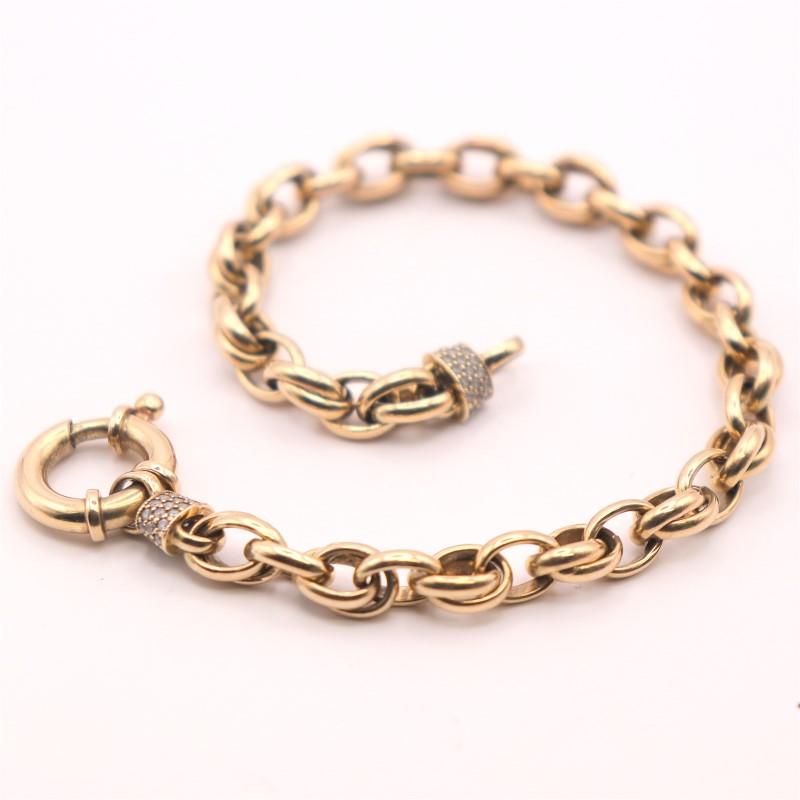 Elegant 9 karat yellow gold belcher chain bracelet. Crafted from high-quality 9K yellow gold, this ladies' bracelet features a smooth, classic belcher design. Accented with 30 clear stones, the bracelet sparkles with subtle brilliance. Weighing a substantial 18.79 grams, it's a timeless and versatile piece suitable for any occasion. The hallmark of .375 ensures the authenticity of the 9 karat gold. All sizes and measurements are approximate.