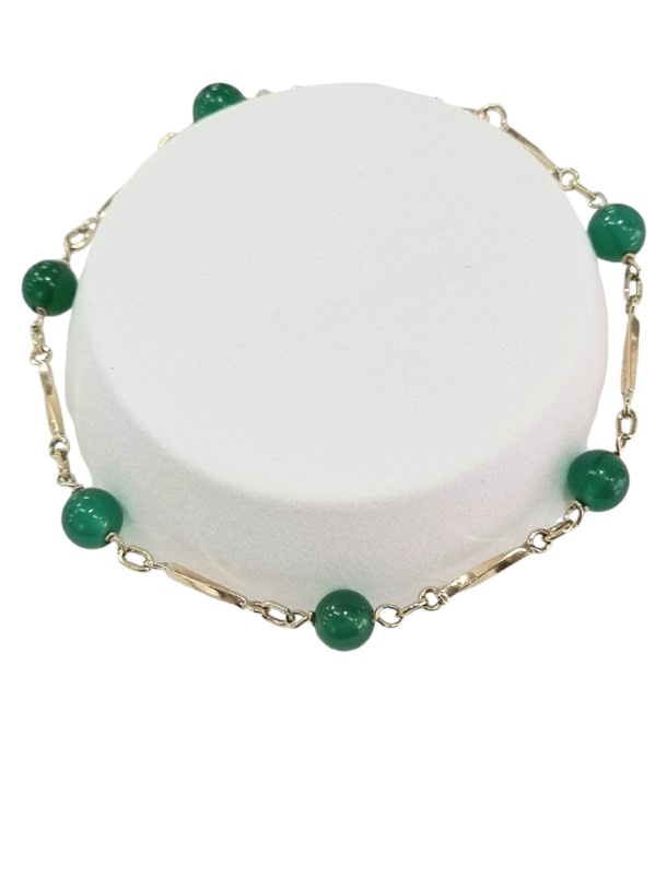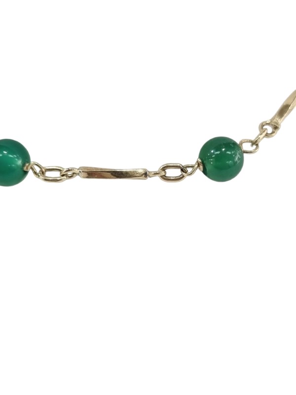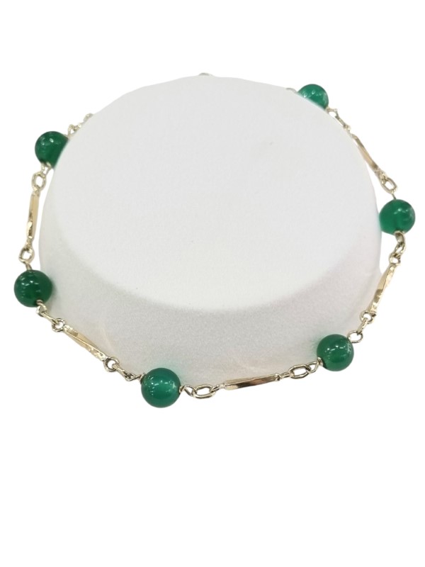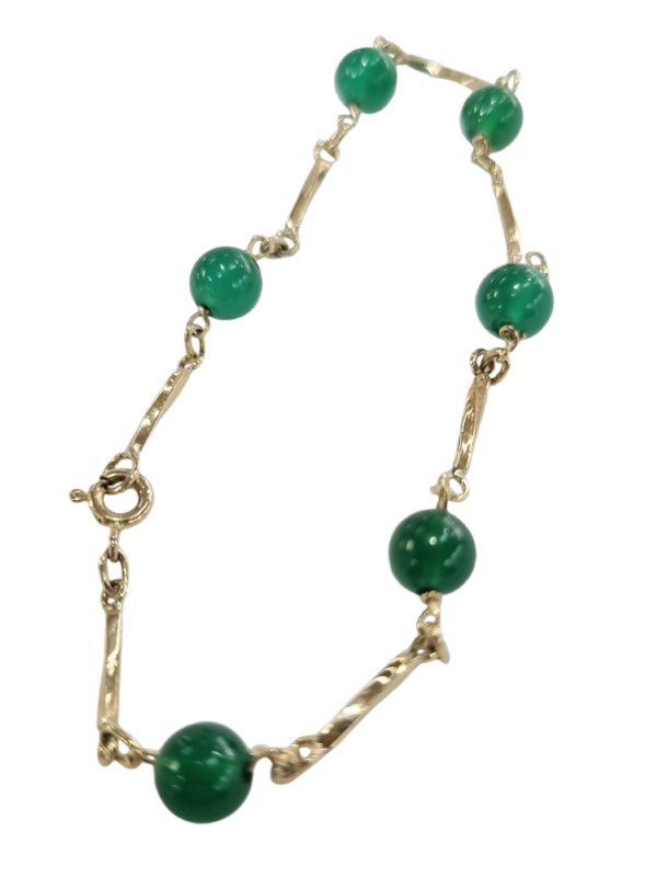 This elegant 9 Karat yellow gold bracelet features a charming array of round jade rondelle beads. Measuring 19 cm in length and weighing a delicate 3.88 grams, this ladies' bracelet is crafted with a .375 hallmark, ensuring quality and authenticity. The vibrant green jade stones bring a refreshing touch of natural beauty to this versatile accessory. All sizes and measurements are approximate.