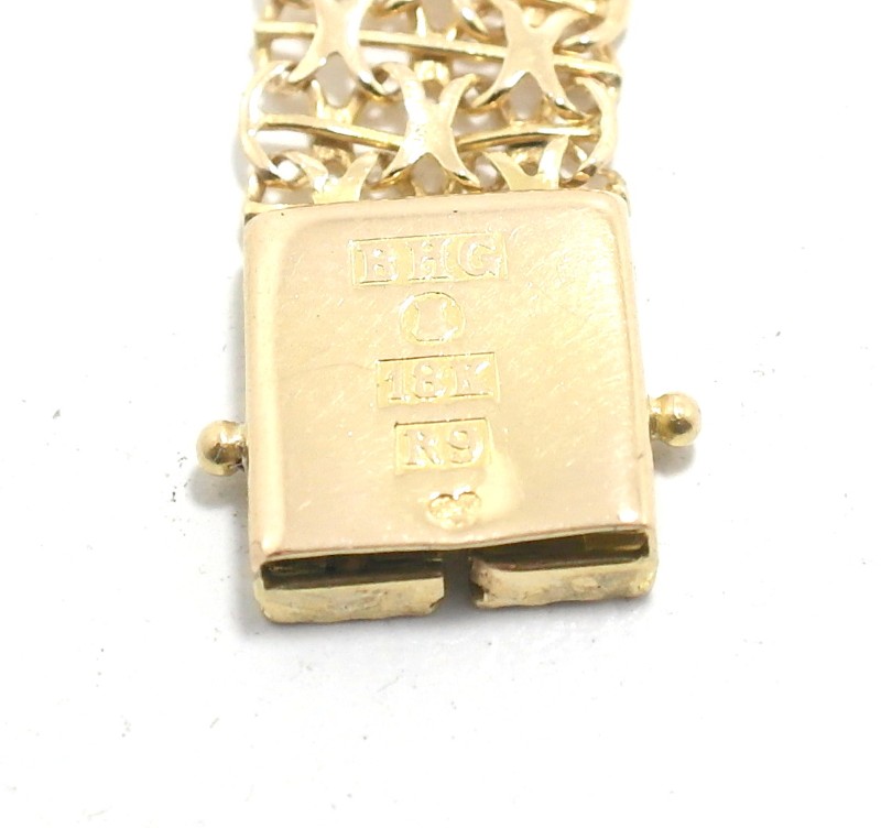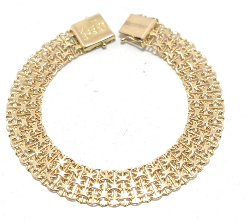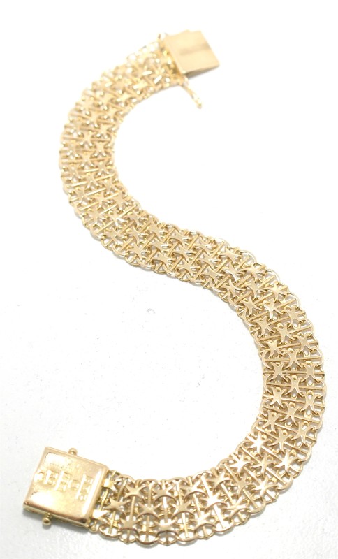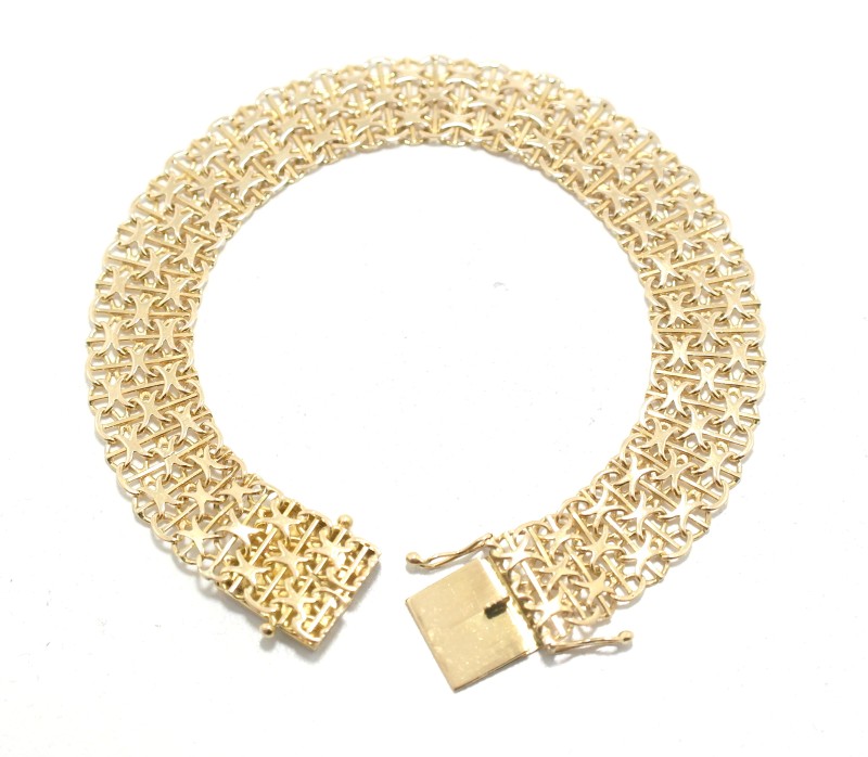 Crafted in lustrous 18K yellow gold, this versatile bracelet is a timeless accessory for the modern lady. The simple yet elegant design features an engraved motif, adding a touch of distinction. Measuring 21cm in length and weighing a substantial 15.35g, this bracelet offers a comfortable and secure fit. Whether paired with casual or formal attire, this 18K yellow gold bracelet is a refined choice for any occasion. All sizes and measurements are approximate.