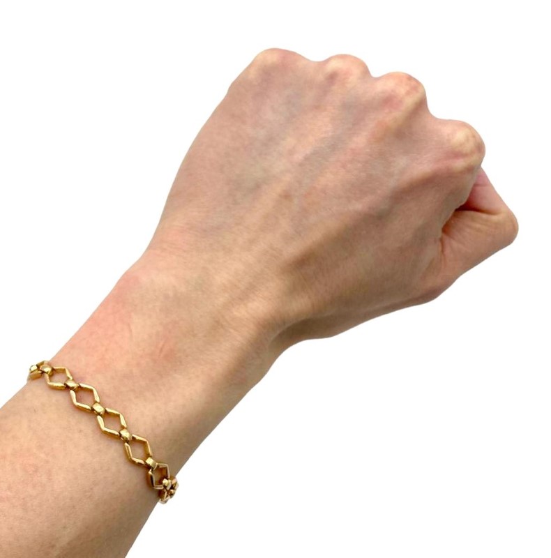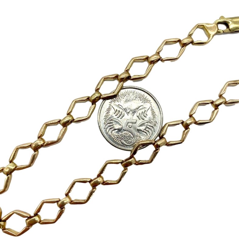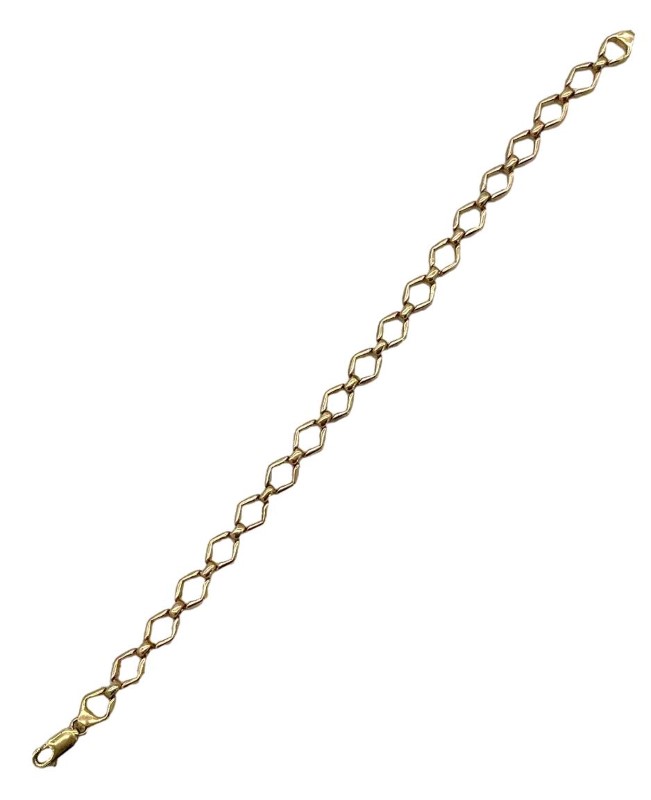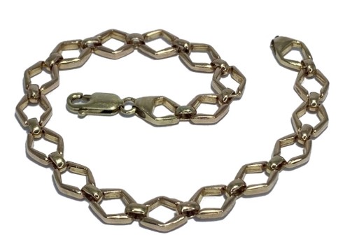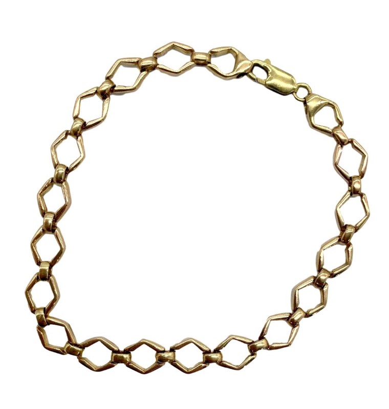 9ct yellow gold hexagonal link bracelet crafted to a length of 21cm, and width of 1.2cm.