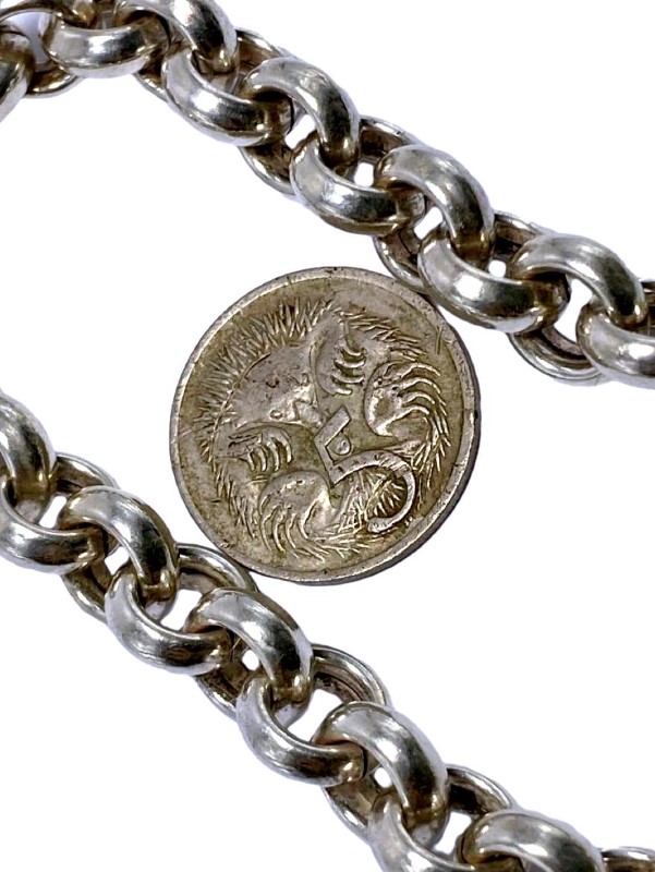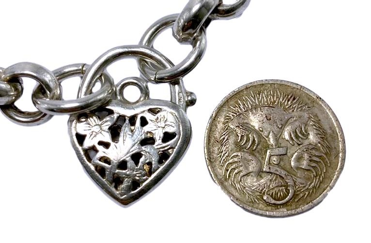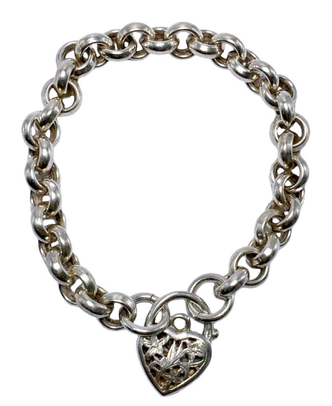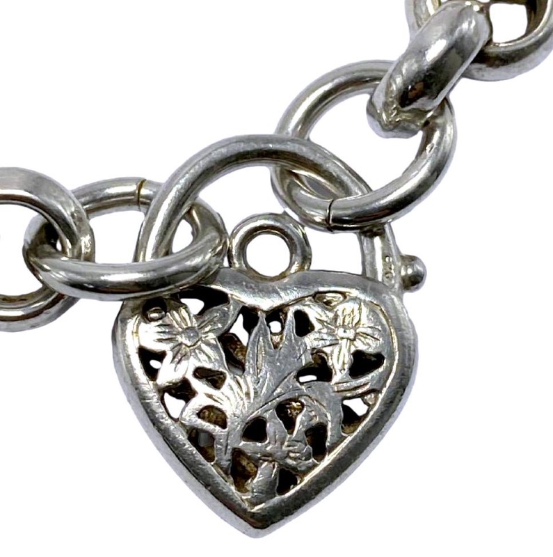 Sterling silver belcher link bracelet with heart clock crafted to a length of 20cm.
