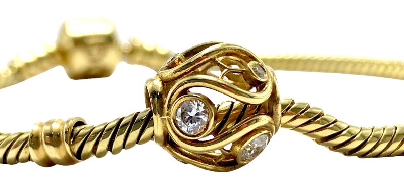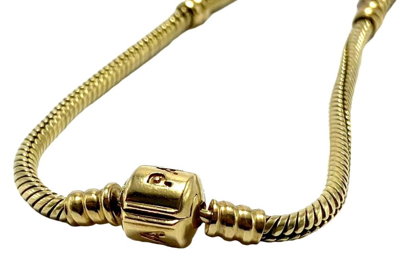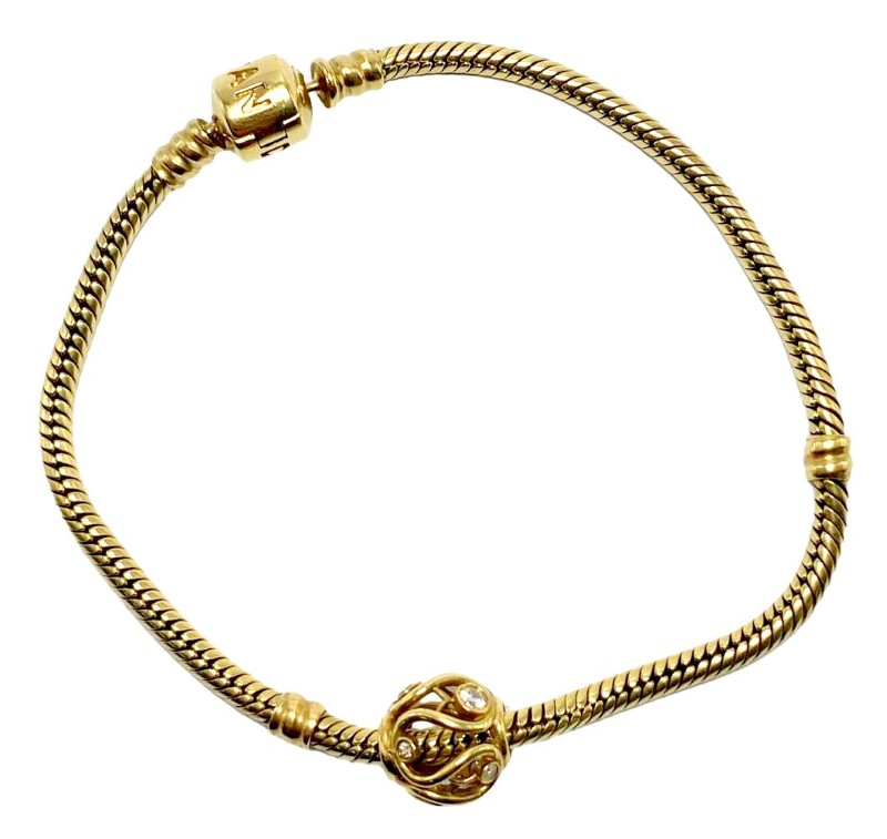 14ct yellow gold Pandora Moments snake chain bracelet with non-Pandora yellow gold & cubic zirconia charm.