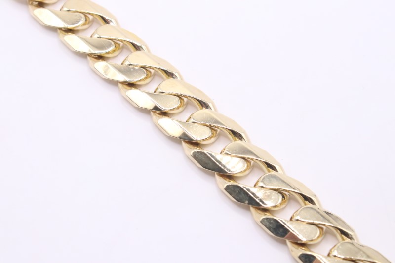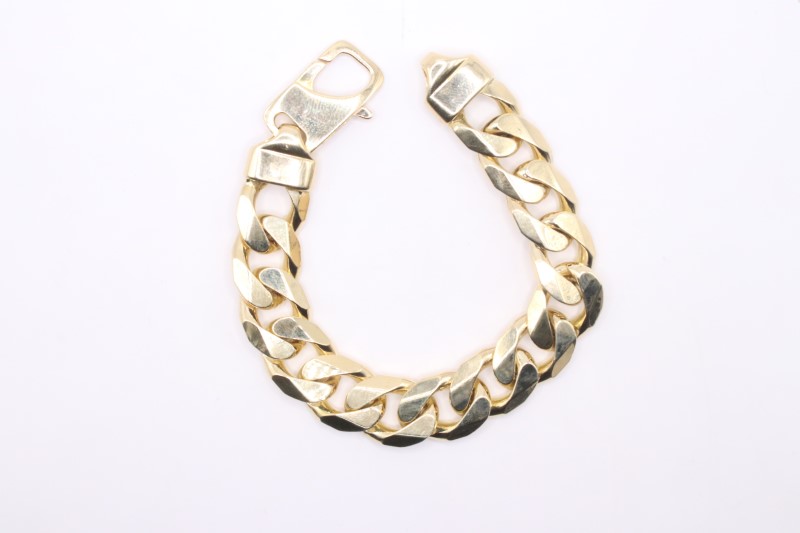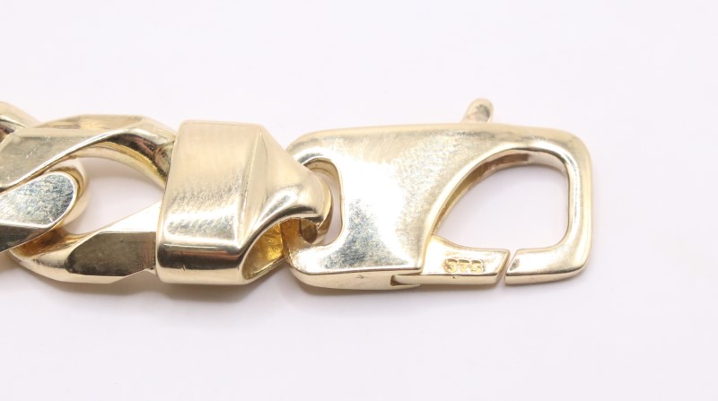 This 9 karat yellow gold curb bracelet features a classic, masculine design. The substantial yellow gold piece measures 21 cm in length and 15 mm in width, weighing a solid 85.01 grams. The engraved detail "375" on the clasp adds a subtle personal touch. Crafted from durable 9 karat yellow gold, this versatile bracelet is a timeless accessory for the modern gentleman. All sizes and measurements are approximate.