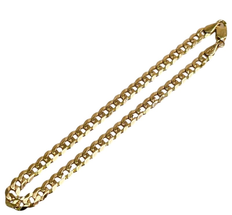This elegant 9 Karat yellow gold curb link bracelet is a versatile accessory perfect for everyday wear. Crafted from high-quality yellow gold with a hallmark of .375, the bracelet measures 20.5 cm in length and 0.4 cm in width, weighing a substantial 3.61 grams. Its classic curb link design adds a sophisticated touch, making it suitable for both casual and formal occasions. All sizes and measurements are approximate.