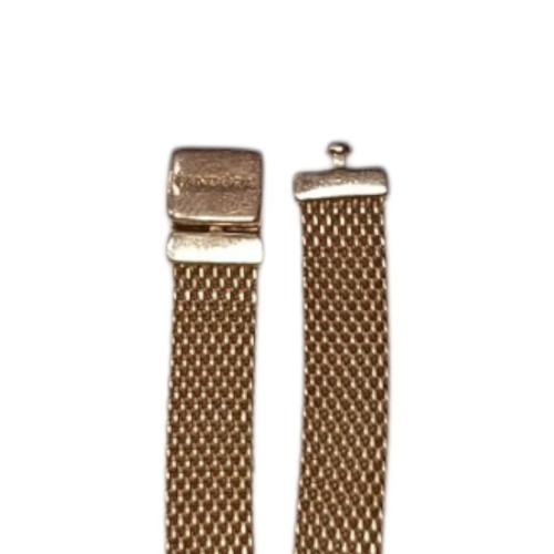 This rose gold plated Pandora Reflexions Mesh bracelet is a stunning accessory. Crafted from metal, it weighs approximately 13.95g and features a textured mesh design. The bracelet is engraved with the Pandora logo, adding a subtle touch of detail. Suitable for ladies, this versatile bracelet can be worn on its own or stacked with other pieces. All sizes and measurements are approximate.