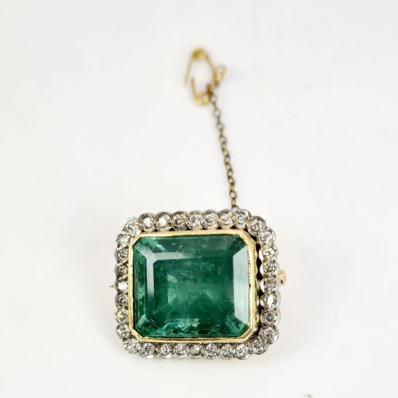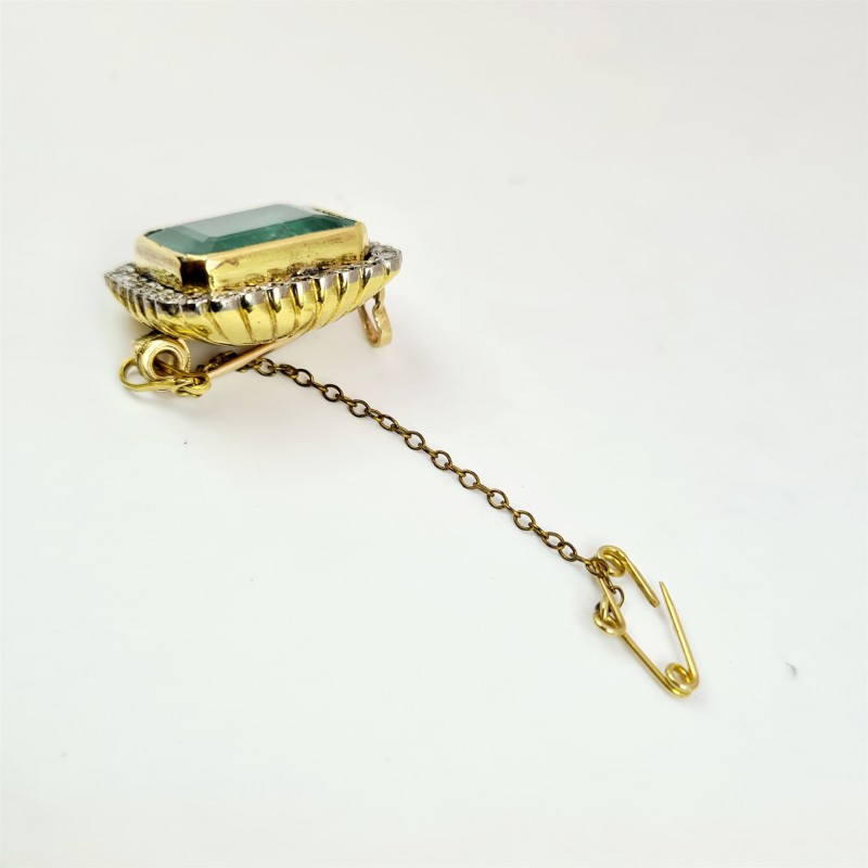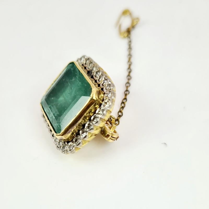 This exquisite 18K yellow gold brooch boasts a striking vintage design, featuring a captivating emerald as its hero stone. The brooch, a classic sub-type, showcases the alluring green hue of the emerald against the warm tones of the precious metal. Weighing a substantial 12.69 grams, this piece is sure to make a bold statement. All sizes and measurements are approximate.