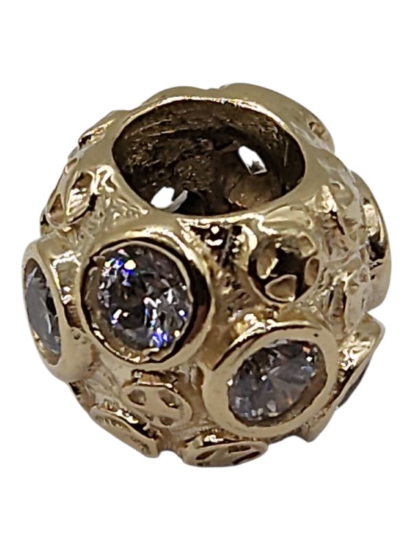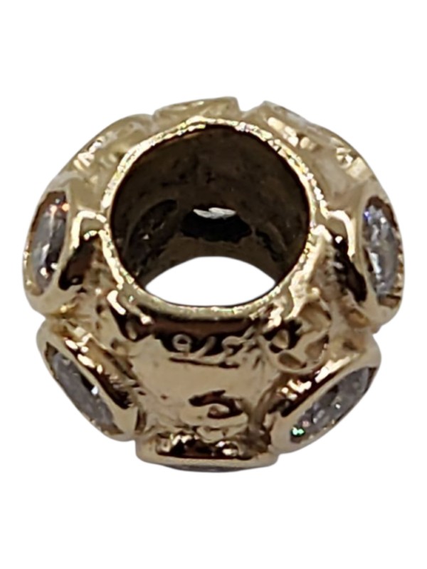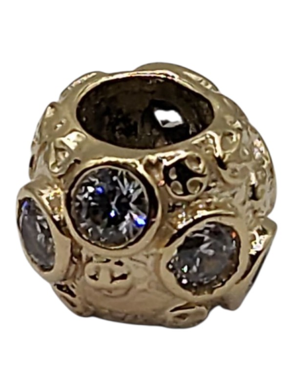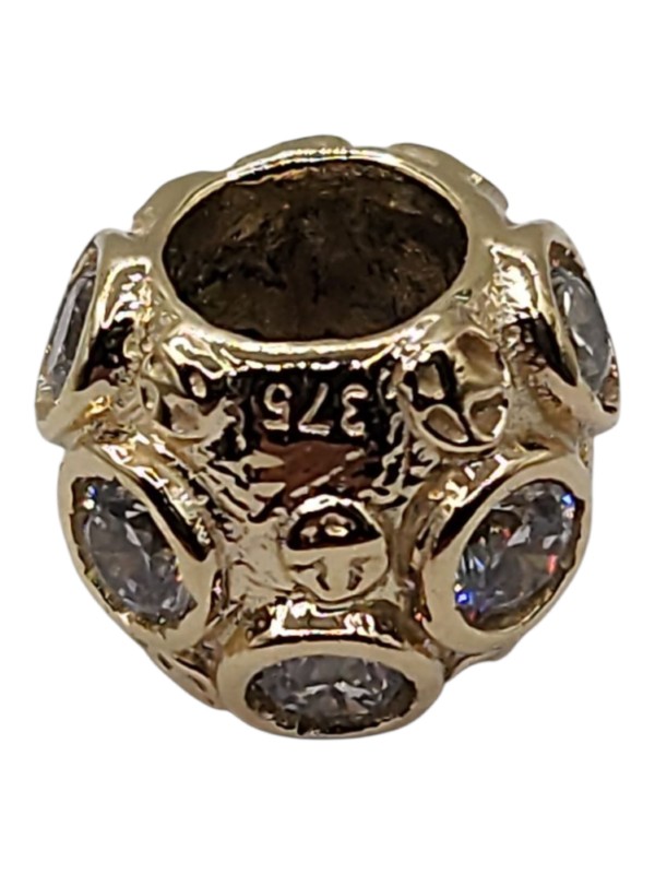 This charming 9ct yellow gold charm features a patterned bead design with 7 clear stones. Weighing 3.56g, this ladies' accessory has a hallmark of .375 indicating 9 karat gold. Pairs perfectly with the "Surreal" pandora style bracelet.